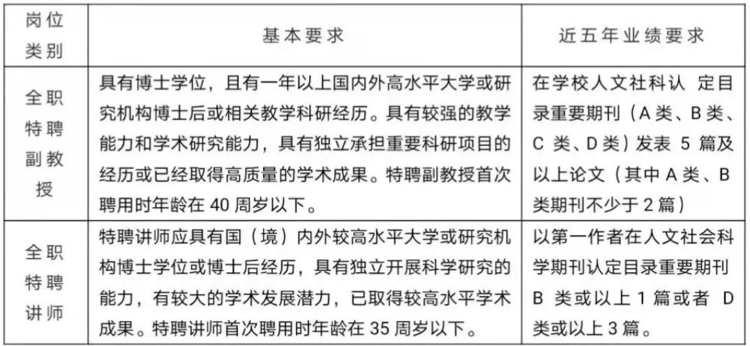 4.全职特聘人才:全职特聘副教授须具有一年以上国内外高水平大学或科研机构博士后或相关教学科研经历,具有较强的教学能力和学术研究能力,有独立承担重要科研项目经历或已取得较高质量的学术成果,首次聘用时年龄在40周岁以下。全职特聘讲师须具有国内外较高水平大学或科研机构博士学位或博士后经历,有独立开展科学研究的能力和较大的学术发展潜力,已取得较高水平学术成果,首次聘用时年龄在35周岁以下。