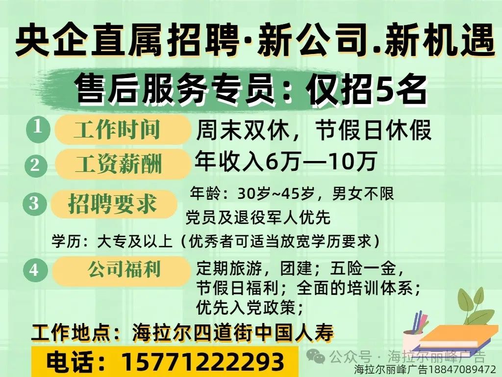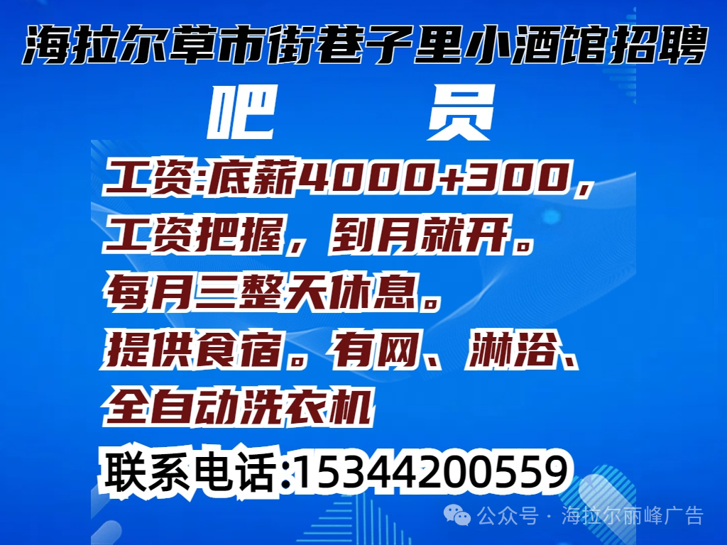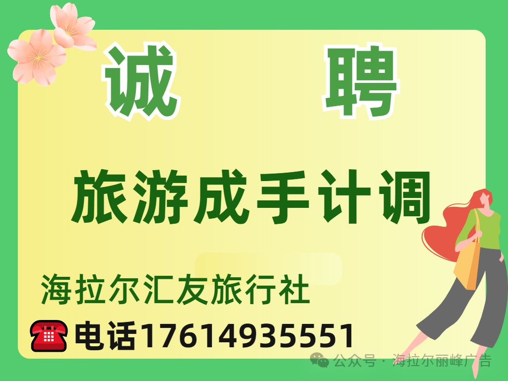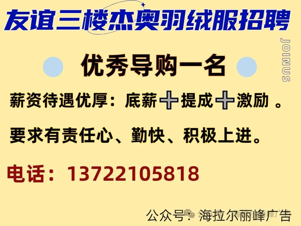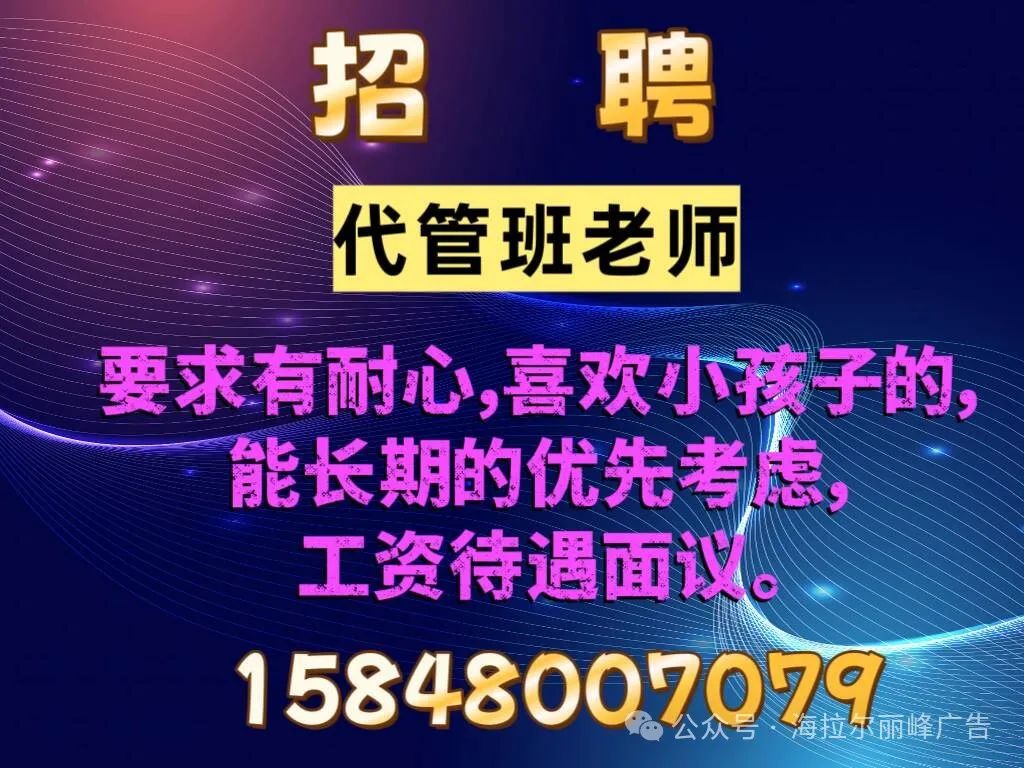 招聘减肥瘦身美体师一名,地址在海拉尔龙凤家园,工作时间相对自由,方便照顾孩子,联系电话15332809444微信同号