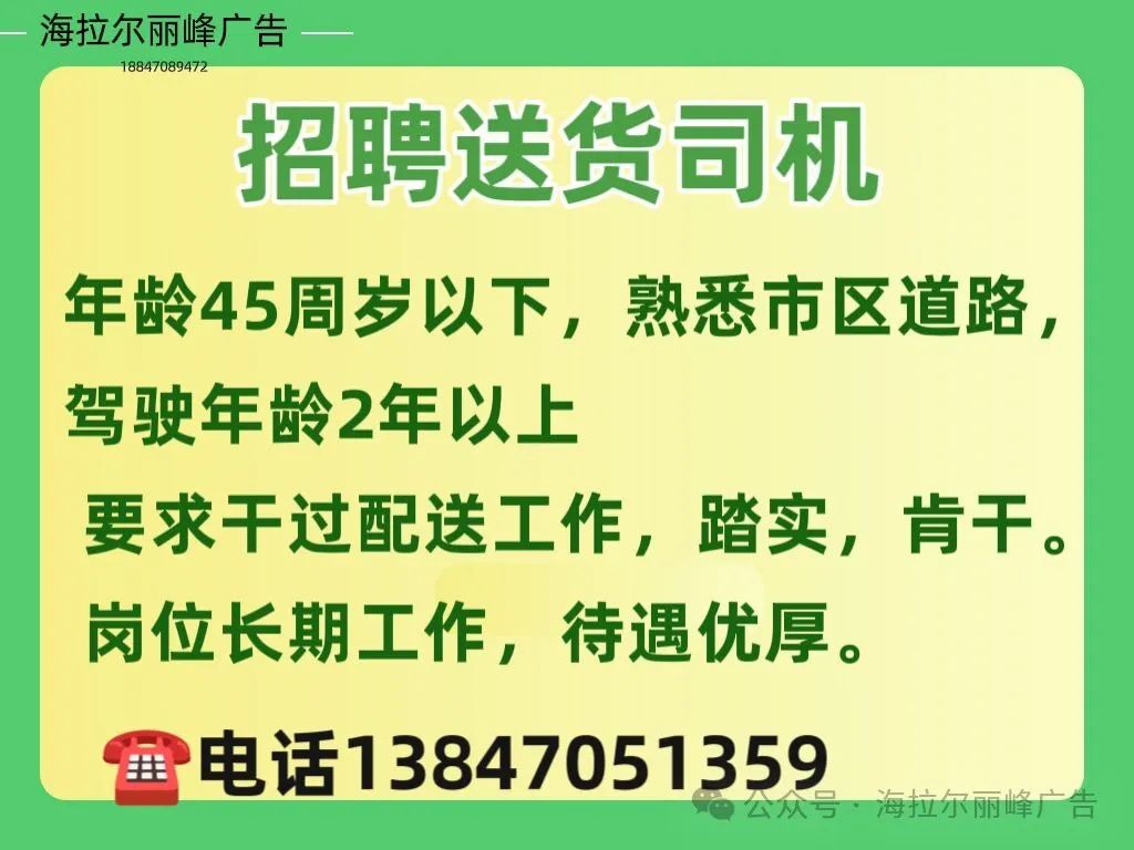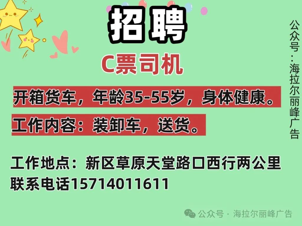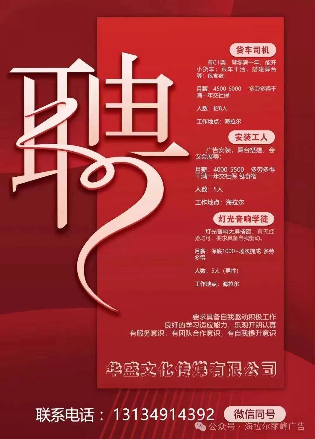 1、货车司机8人:有C1票,驾龄满一年:能开小货车、跟车干活、搭建舞台等;包食宿:月薪:4500-6000 多劳多得,干满一年交社保。2、安装工人5人:广告安装,舞台搭建,会议会展等;月薪:4000-5500多劳多得,干满一年交社保,包食宿。灯光音响大屏搭建,有无经验均可,要求具备自我驱动。