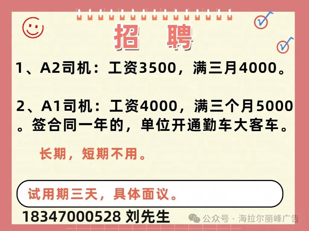 2、A1司机:工资4000,满三个月5000。签合同一年的,单位开通勤车大客车。