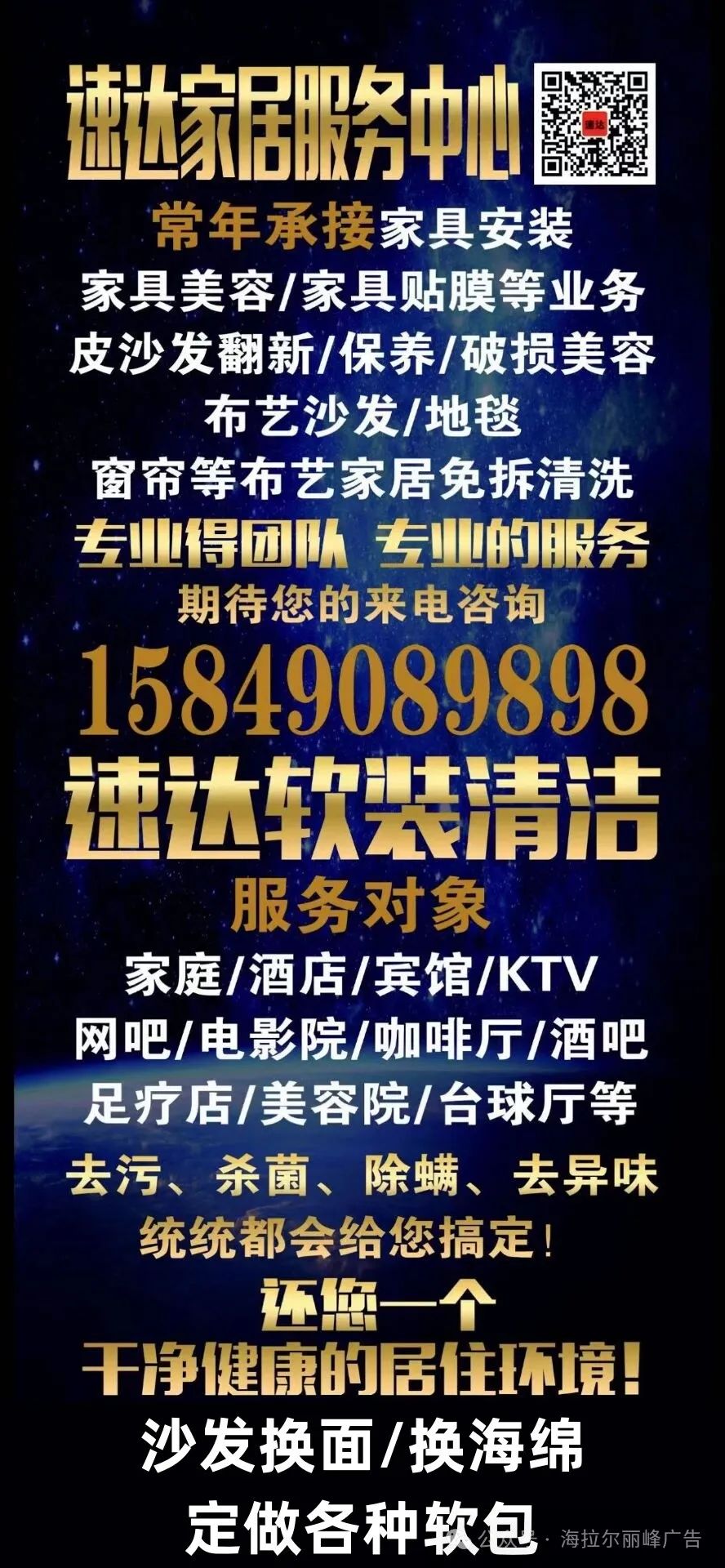 5、速达软装清洁:去污,杀菌,除螨去异味统统都会给您搞定,还您一个干净健康的居住环境。服务对象:家庭,酒店宾馆,KTV,网吧,电影院,咖啡厅,酒吧,足疗店,美容院,台球厅等。专业的团队,专业的服务,期待您的来电咨询:15849089898。