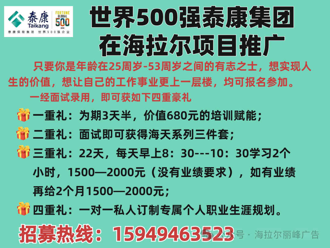 世界500强泰康集团在海拉尔项目推广 只要你是年龄在25周岁-53周岁之间的有志之士,想实现人生的价值,想让自己的工作事业更上一层楼,均可报名参加。