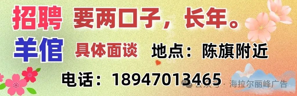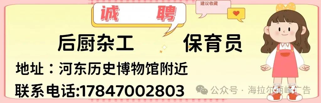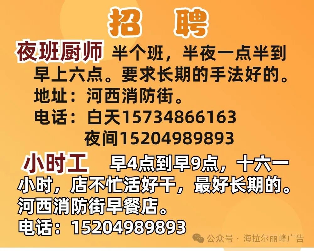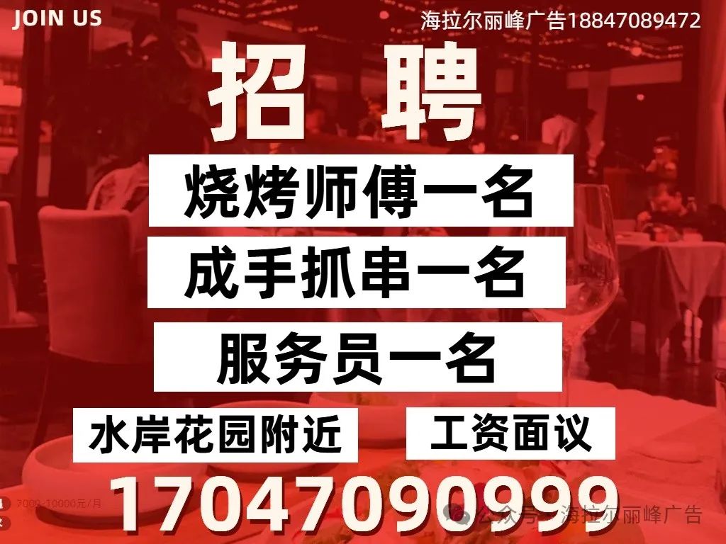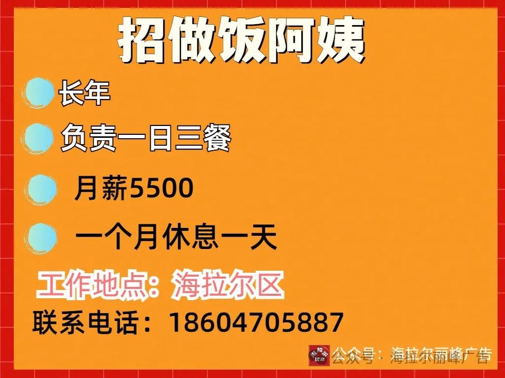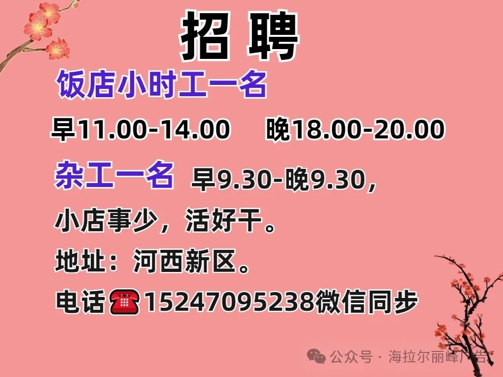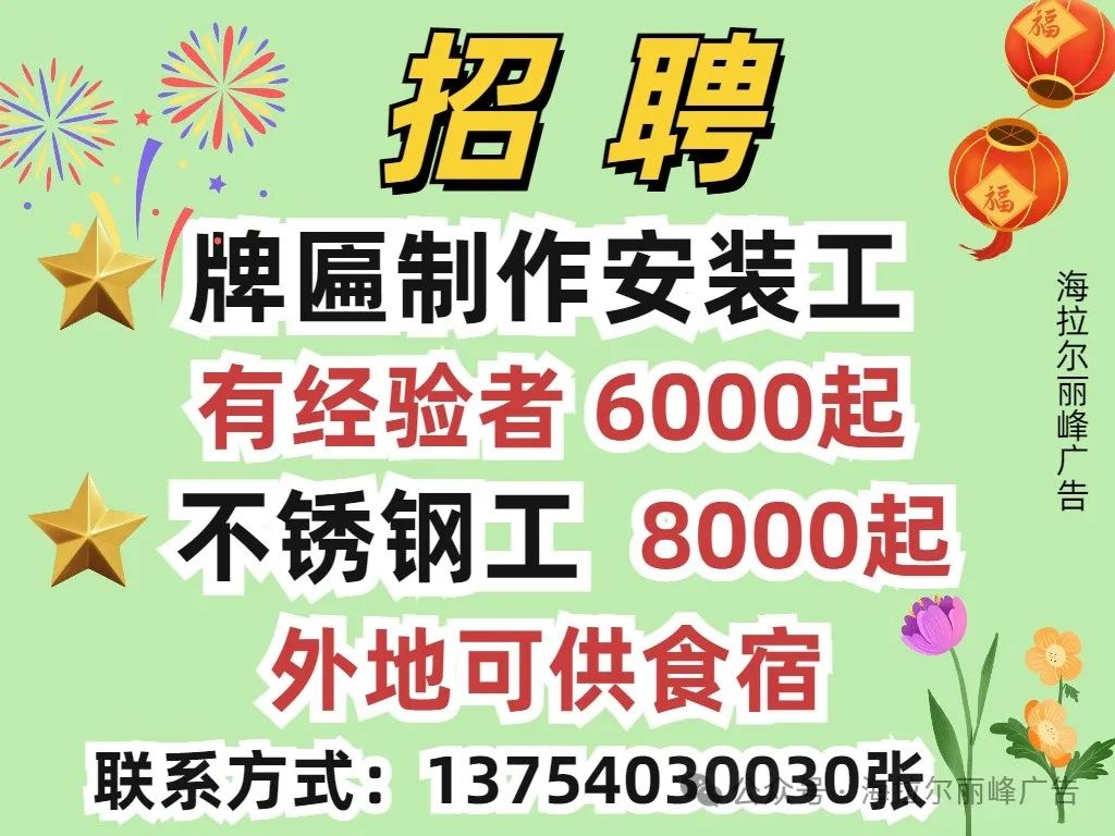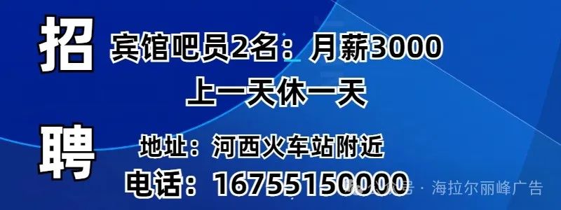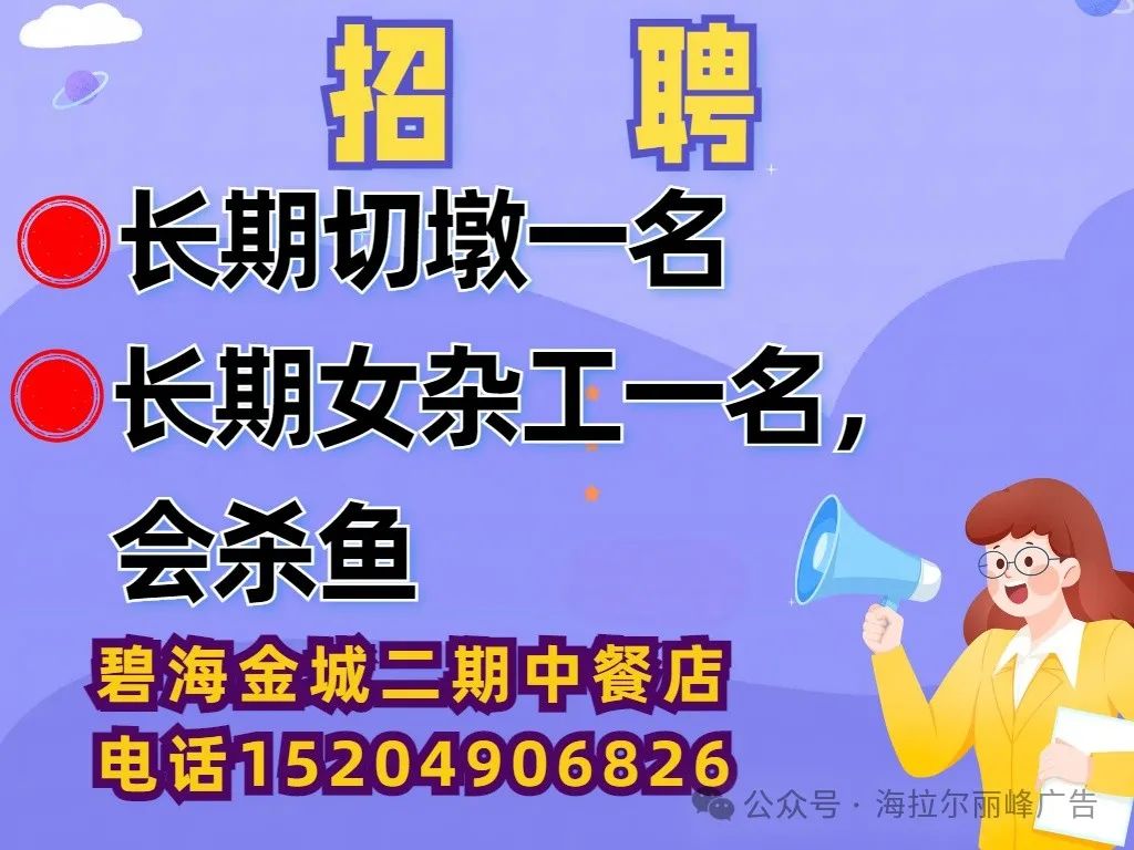 招聘女工两名,最好是海拉尔当地人,工作时间早7点到下午6点,地址海拉尔区华鸿农贸市场,联系电话13848087377