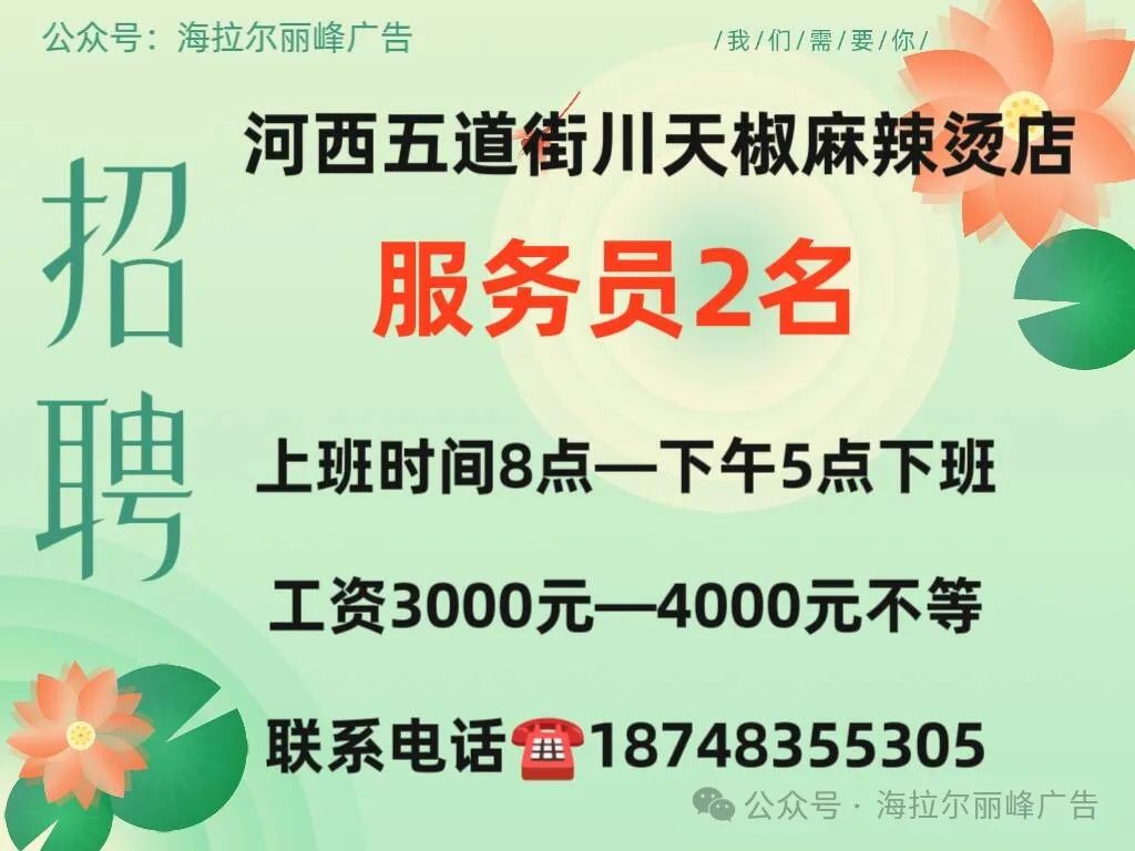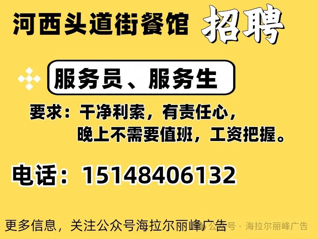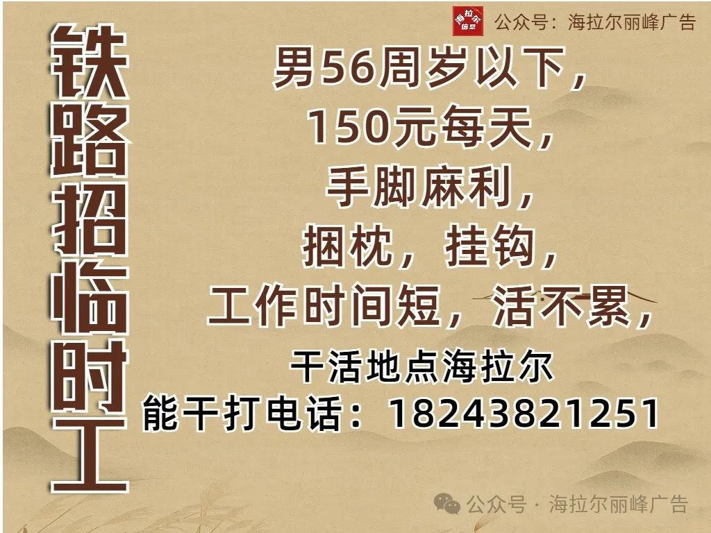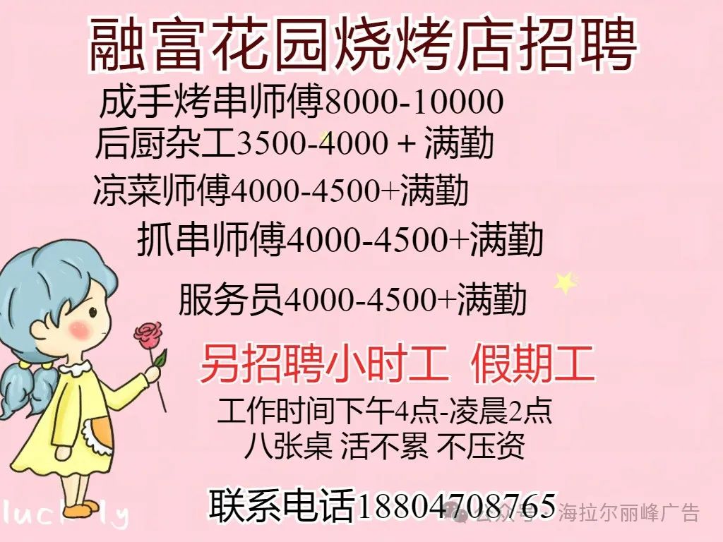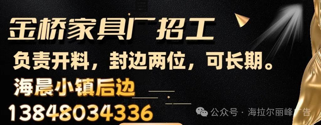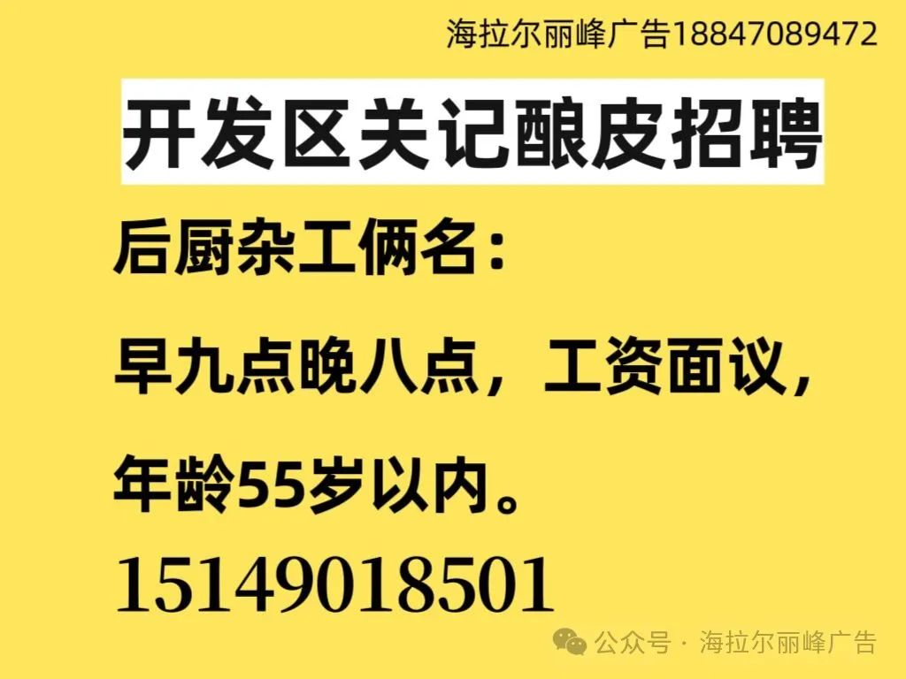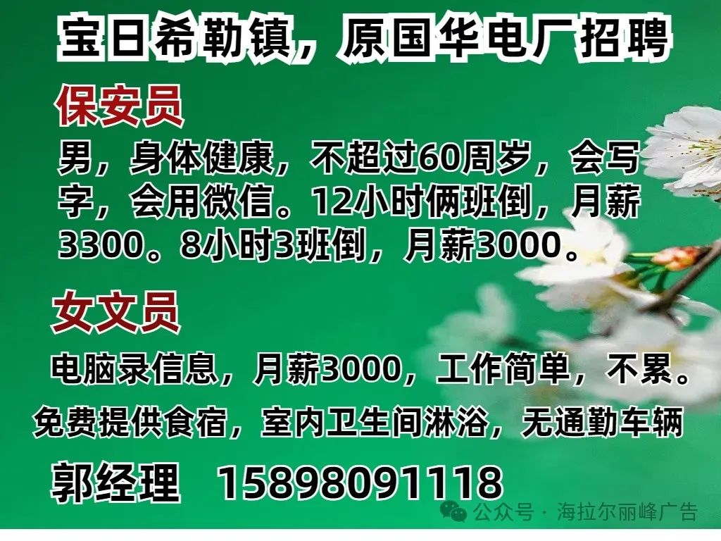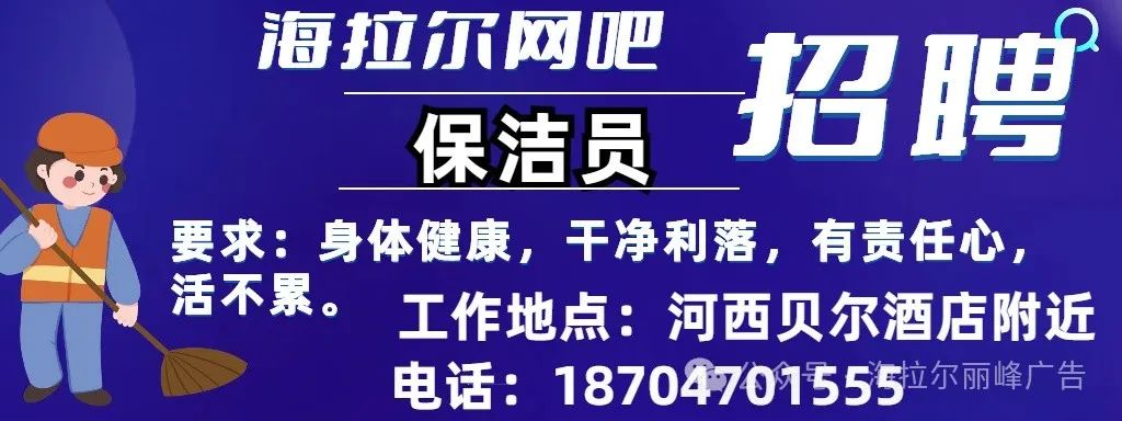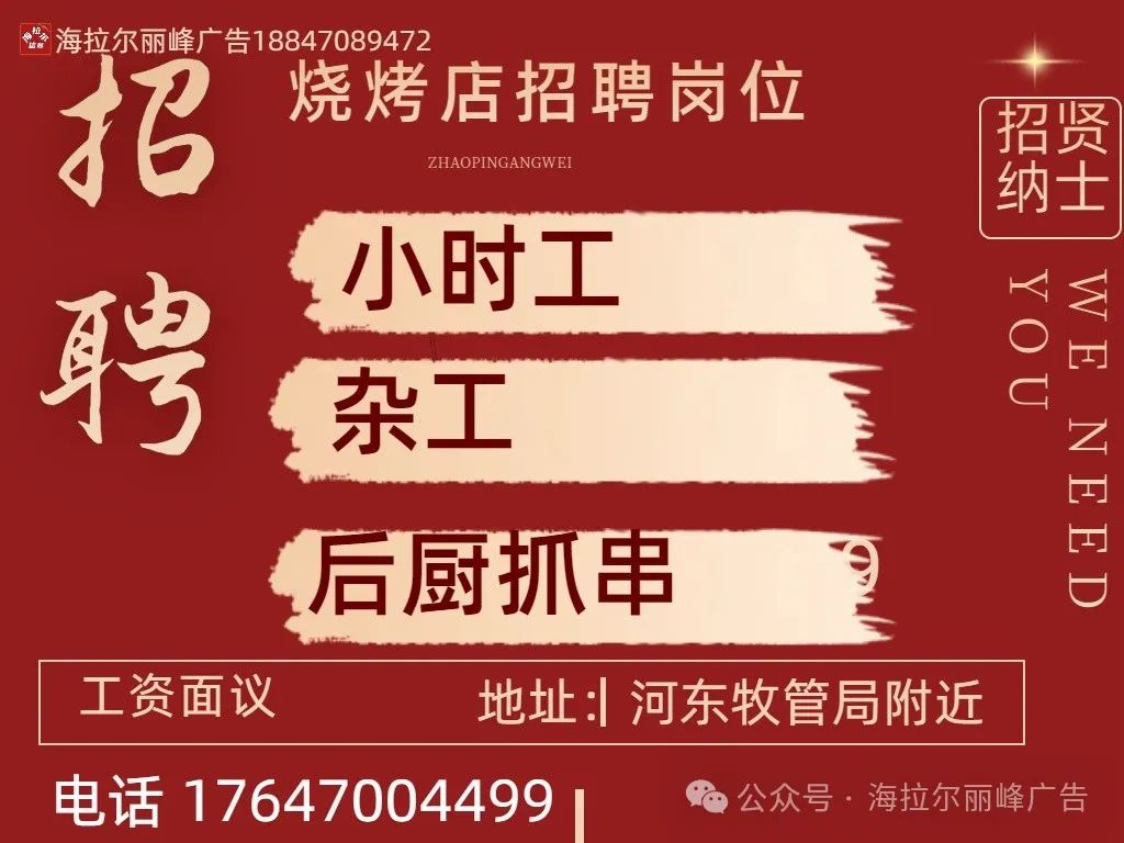 招聘女工两名,最好是海拉尔当地人,工作时间早7点到下午6点,地址海拉尔区华鸿农贸市场,联系电话13848087377