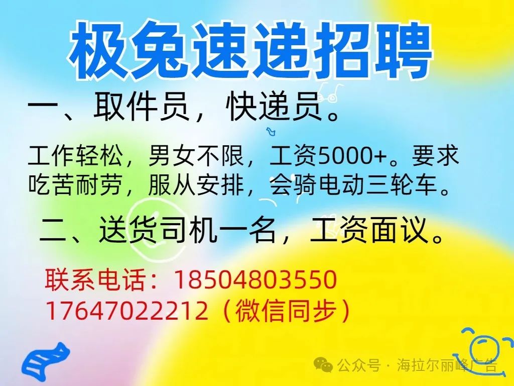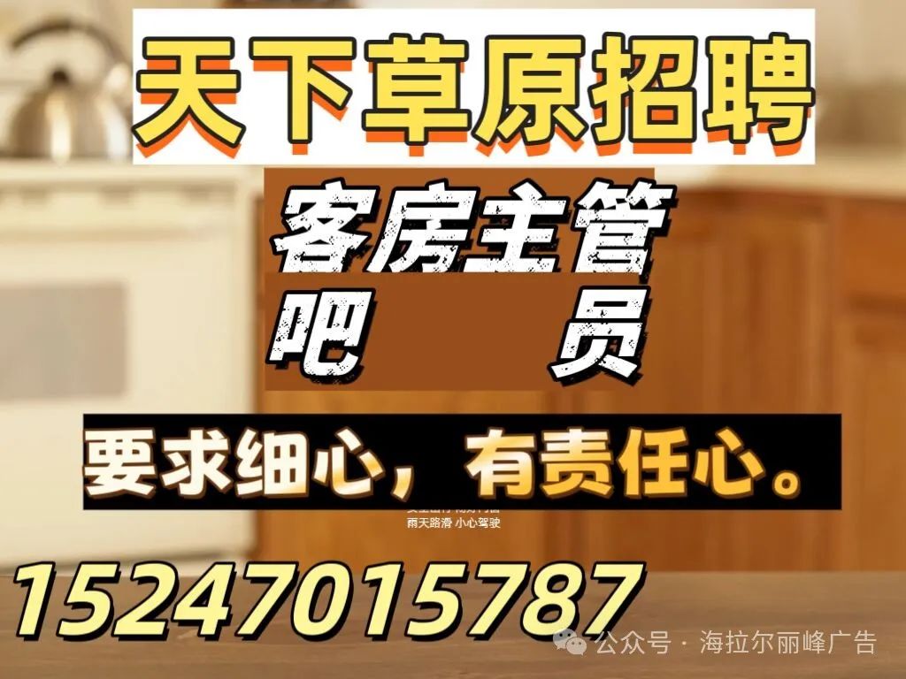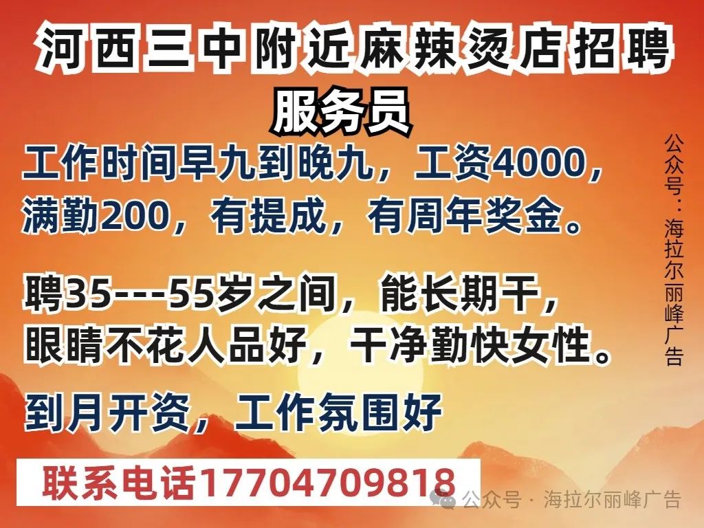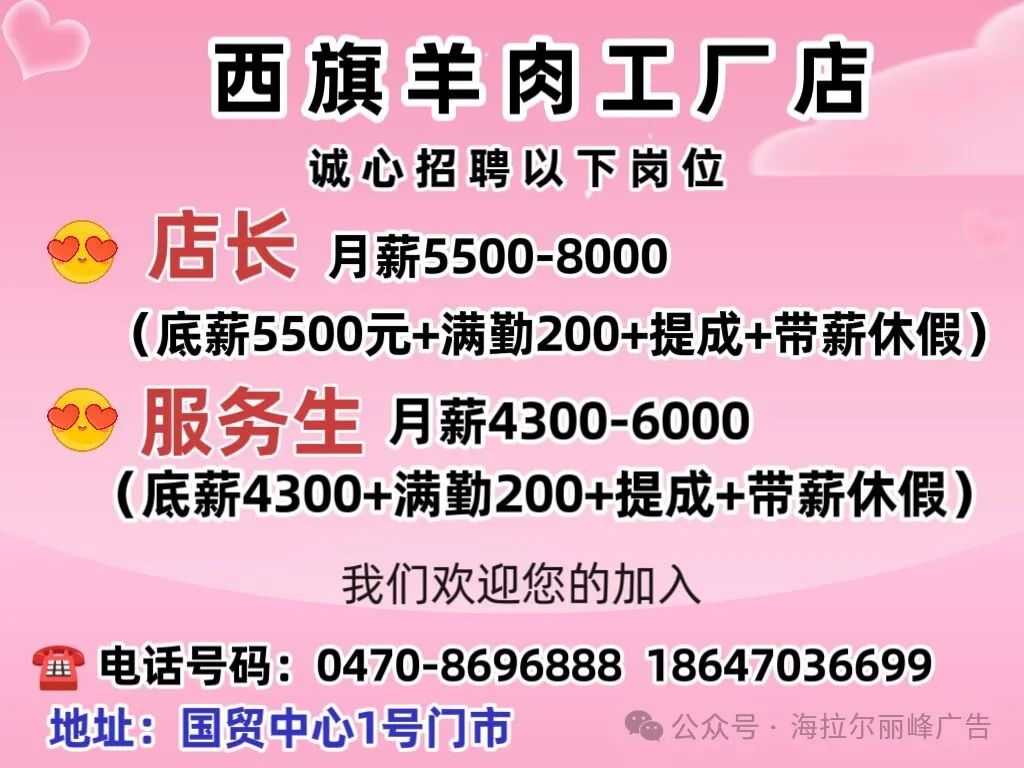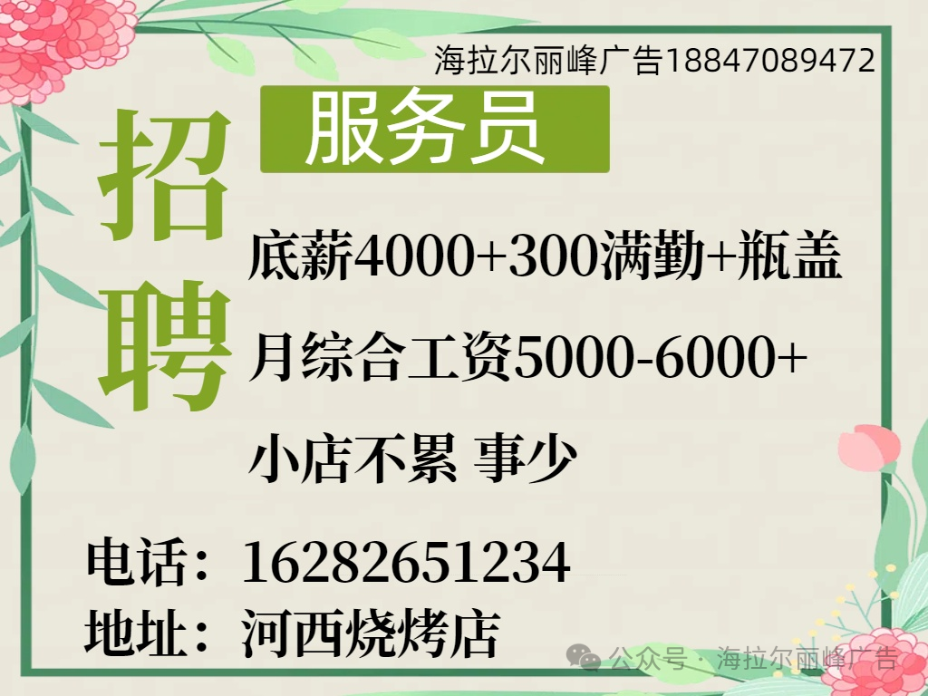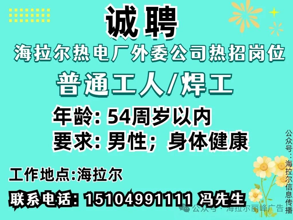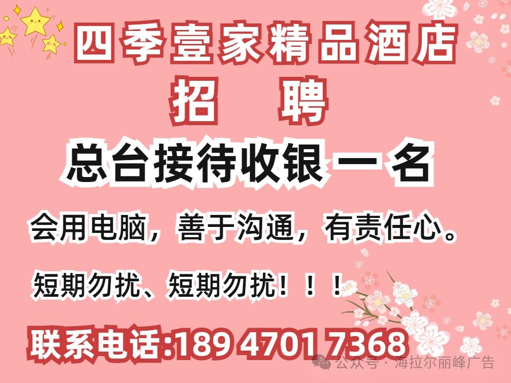 招聘女工两名,最好是海拉尔当地人,工作时间早7点到下午6点,地址海拉尔区华鸿农贸市场,联系电话13848087377