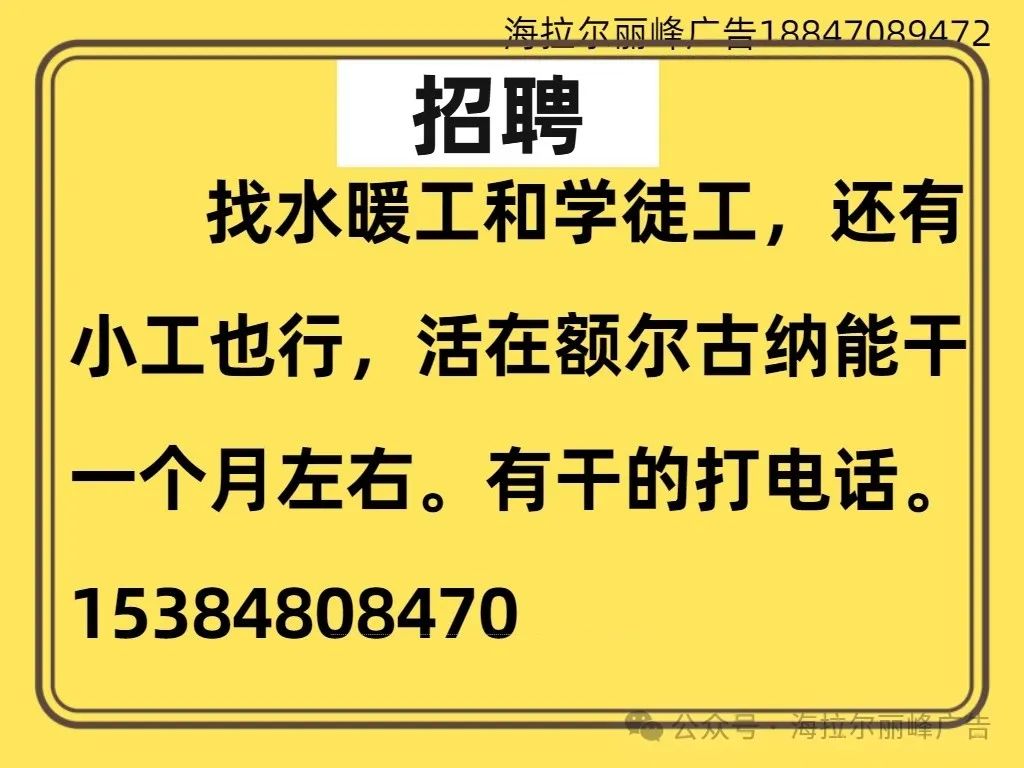 招聘:水暖工一名,活儿在额尔古纳。15384808470
