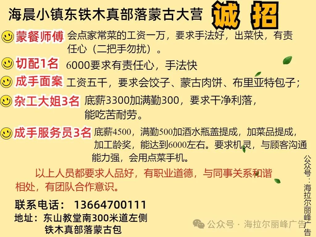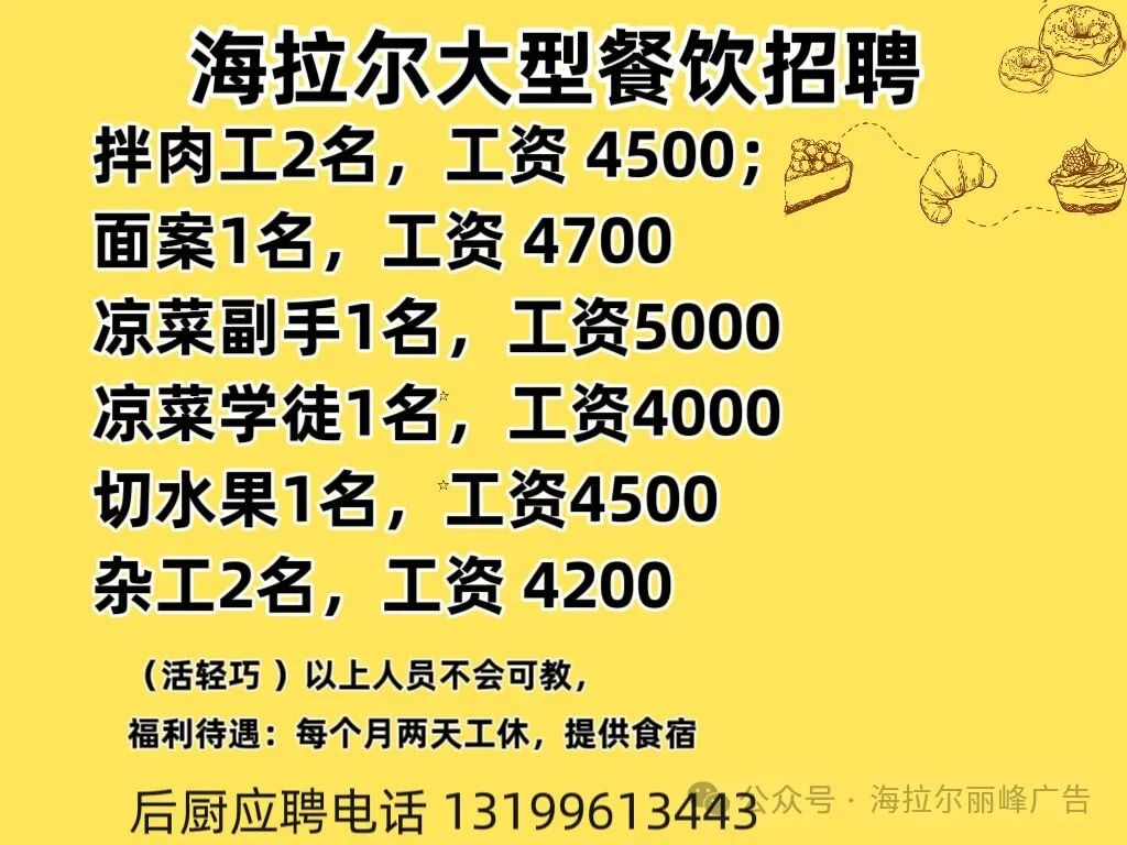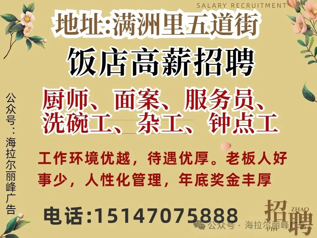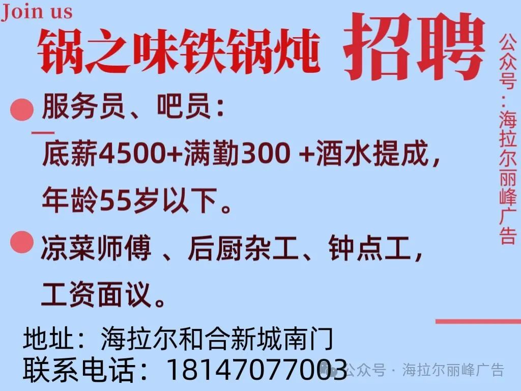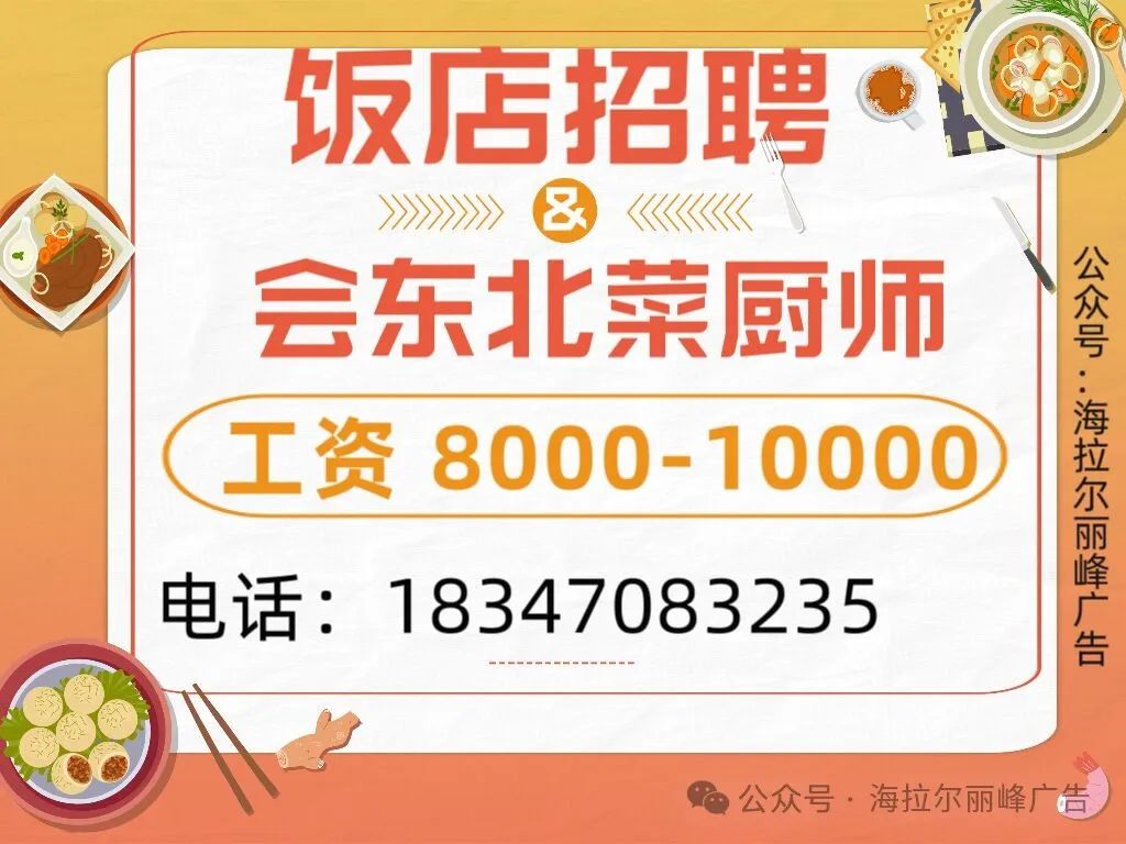 额尔古纳市,黑山头新镇招聘厨师一名,要求手法快,干净利索,会烤全羊。工资12000联系电话13947002277