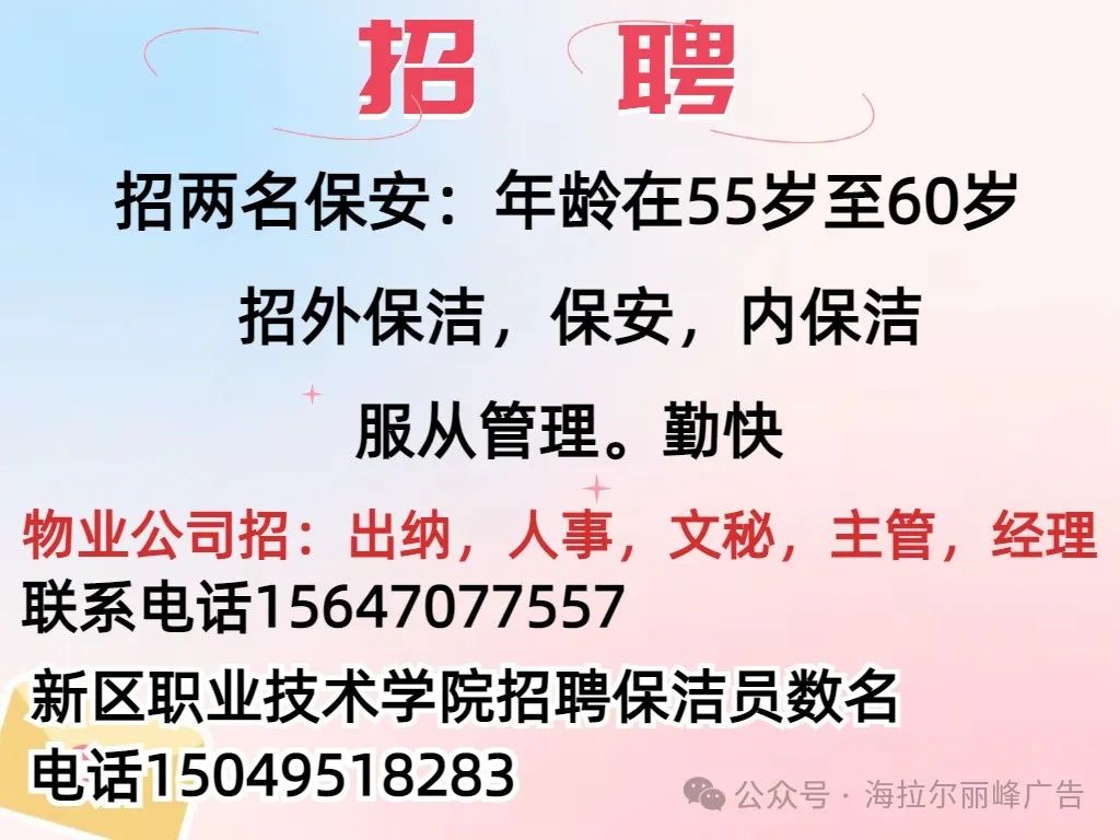呼伦贝尔职业技术学院招聘项目经理,保安、内保洁2100元,各多名。保安要求形象好,退役军人优先。联系电话15049518283