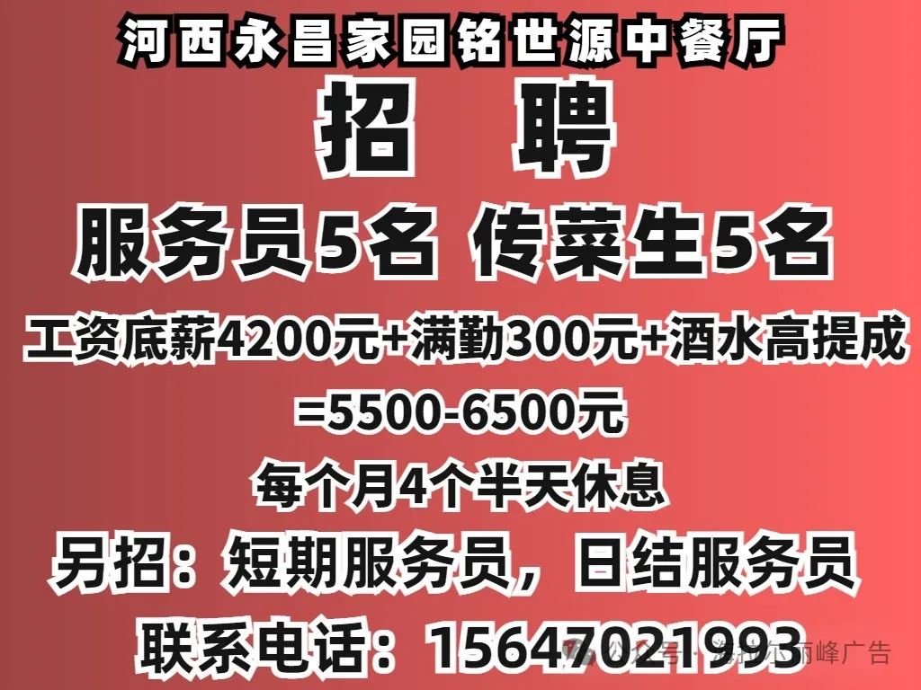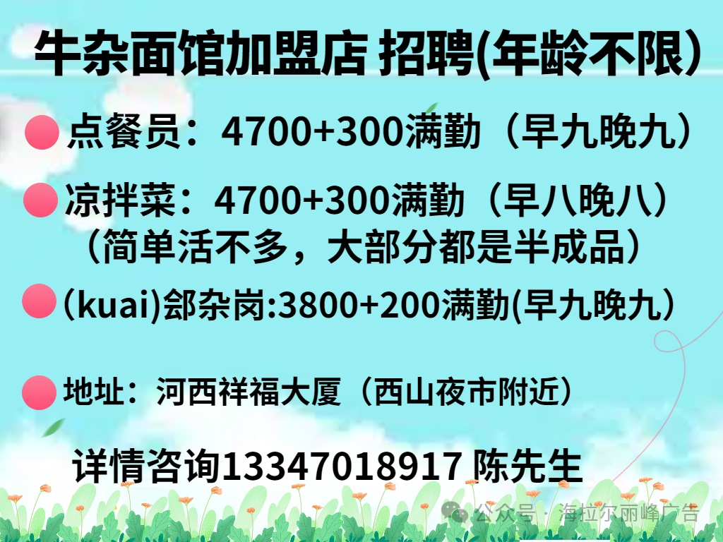 1、服务员 4500元(中午11点至2点。晚上5点至9点)3、帮厨 2000元(中午11点至2点。晚上5点至9点)联系电话:18618162233 18204703555