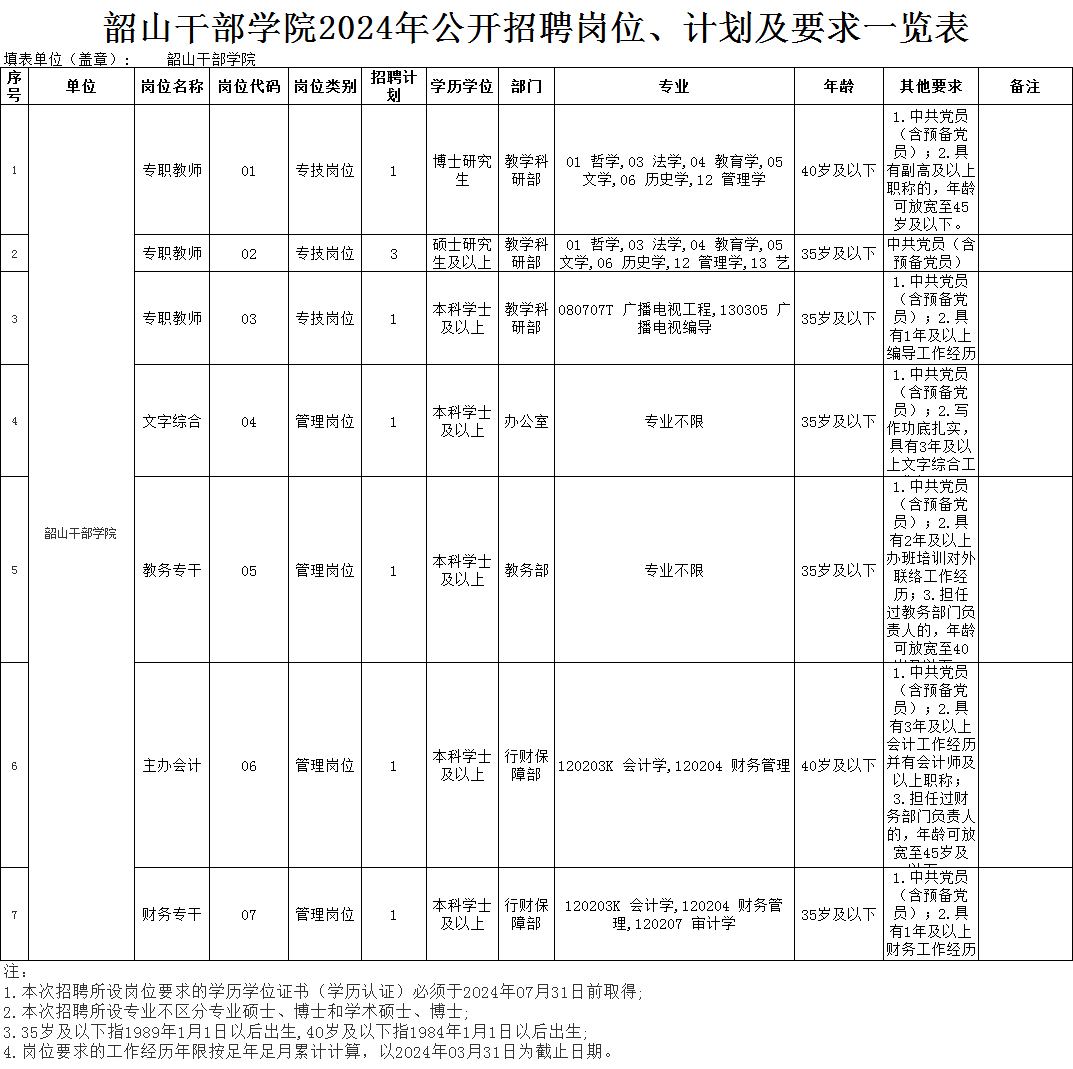 招聘岗位明确要求有工作经历的,应聘人员必须提供工作经历证明(加盖工作单位公章)。在全日制学校就读期间参加社会实践、实习、兼职等不能视为工作经历。工作经历年限按足年足月累计计算,以2024年3月31日为截止日期。