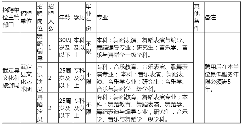 武定县文化艺术团舞蹈编导1名、声乐演员2名、舞蹈演员2名。具体岗位及要求详见下表