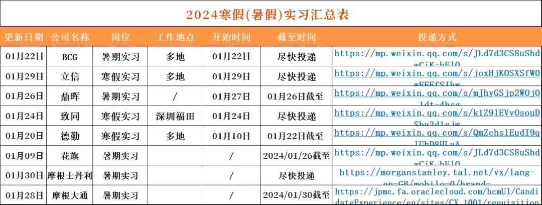 1:我们对接了大量的企业HR/高管/项目负责人/项目组成员/继任招募者,委托我们发布的实习/全职招聘信息都具有非常强的时效性!每日精选10条以上当日最新实习信息,会员专属!2:我们会定期整理,分时间:春招/秋招网申汇总表、寒暑假实习信息汇总表、远程实习信息汇总表等...分行业:国企央企汇总表/金融/咨询/互联网/事务所/快消岗位汇总表/国家部委招聘信息等等,每周第一时间分享到VIP会员群!部分展示如下👇3:整理2024最新求职资料,包括简历模板,行业知识、笔试真题、模拟题、面试资料、求职指南、技能自学攻略等等,都会第一时间分享给VIP会员。部分展示如下👇