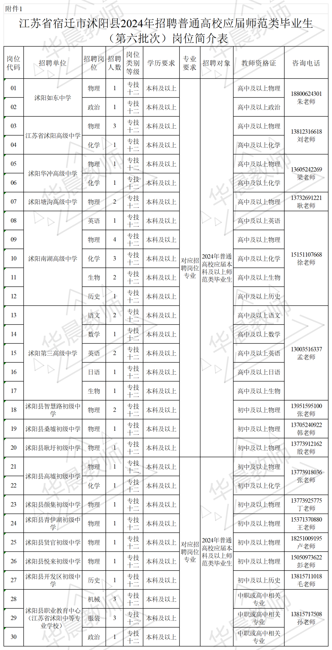招聘单位、岗位及相关要求等详见《江苏省宿迁市沭阳县2024年招聘普通高校应届师范类毕业生(第六批次)岗位简介表》(附件1,以下简称《岗位简介表》)。