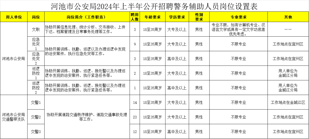河池市公安局本次招聘警务辅助人员67人,具体招聘岗位、人数、资格条件详见《河池市公安局2024年上半年公开招聘警务辅助人员岗位设置表》(附件1)。