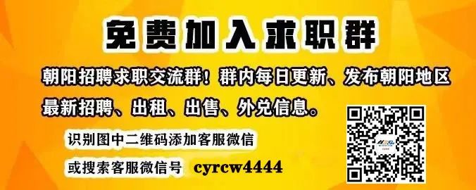 联系时请说明是在《朝阳人才网》看到的更多招聘信息请关注《朝阳人才网》公众号,三万多份求职简历,几百家招聘单位供你选择。还有免费区让你发布招聘信息,更多惊喜等着你!!!