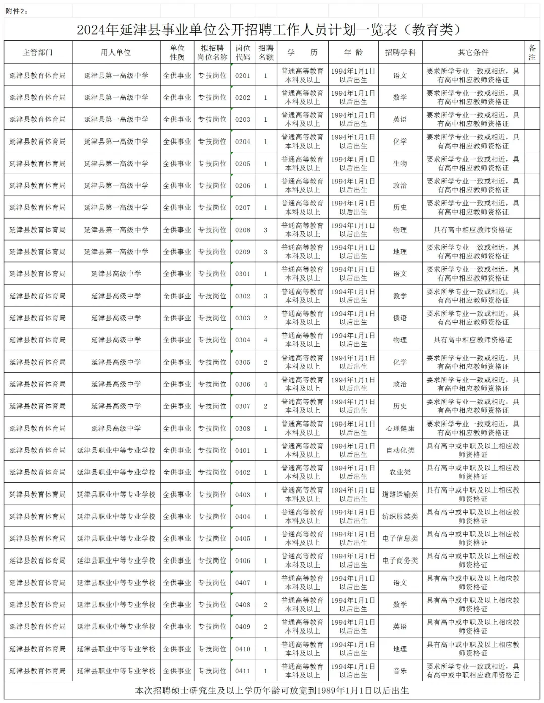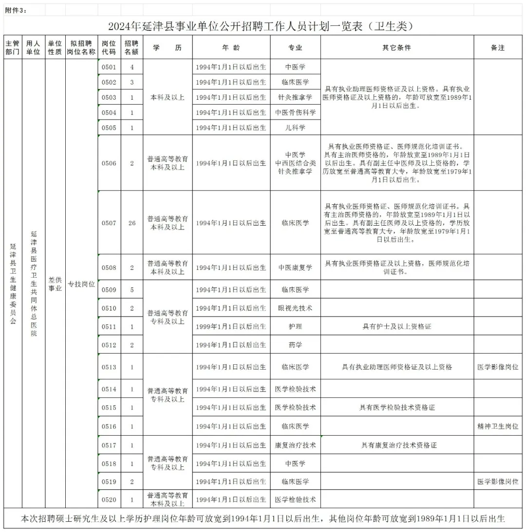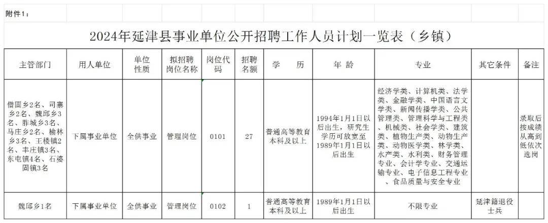 具体招聘单位、岗位、人数、岗位条件等内容详见《2024年延津县事业单位公开招聘工作人员计划一览表》(附件1、2、3)。(五)全日制技工院校高级工班、预备技师(技师)班毕业生,可分别参照相对应的同等大专、本科学历报考;(七)岗位所需要的其他条件(详见附件1、2、3);1.教育类岗位暂未取得教师资格证的考生,可凭有效期内《中小学教师资格考试合格证明》或《师范生教师职业能力证书》报名本次招聘考试。考生必须在考察阶段取得相应教师资格证。其他报考岗位要求的资格证书等资格条件,报考者应当在报名前具备相应资格条件。2.专业条件按照国务院学位委员会和教育部《职业教育专业目录》(2021年版)、《普通高等学校本科专业目录》(2023年版)、《研究生教育学科专业目录》(2022年版)和人力资源社会保障部《全国技工院校专业目录(2022年修订)》执行。1.曾因犯罪受过刑事处罚、刑事处罚期限未满或者涉嫌违法犯罪正在接受调查的人员;3.曾在公务员招录、事业单位公开招聘考试中被认定有舞弊等严重违反招聘纪律行为不满5年人员;5.现役军人、普通高等院校在读的非2024年应届毕业生;1.“年龄”表述中的“*年1月1日以后出生”和“学历、学位”表述的“及以上”均包括“含”。2.条件设定中普通高等教育本科专业目录与研究生专业目录不一致的同类专业,可视为相近专业报考。3.2017年起,由国家统一下达招生计划的非全日制硕士研究生学历、学位证书,同全日制硕士研究生具有同等法律地位和相同效力。2024年5月28日在延津县人民政府网站(www.yanjin.gov.cn)发布招聘公告。报名办法:报考人员只能选择一个岗位(专业)报名,报名与参加考试时使用的身份证必须一致。报考人员必须按照本人毕业证、身份证等相关证件显示的专业名称、个人情况填写报名信息,如信息不一致或故意填报虚假信息造成的后果,由考生本人承担。报考人员于2024年6月3日9:00至6月6日17:00期间登录延津县人民政府网站(www.yanjin.gov.cn)进入“网上报名”系统,按要求提交个人报名信息并上传本人电子照片(近三个月内免冠正面证件照,红底、蓝底、白底均可,jpg格式;上传照片须将证件照上传到报名系统,经过报名系统自带的照片处理工具处理后直接上传。照片必须反映本人特征,否则无法通过审查)。考生填写报名信息并上传照片成功后,必须点击“提交审核”。报名资料提交被接收后,系统将自动生成一个报名序号。报名序号是报考人员查询报考资格审查结果、网上缴费、下载打印准考证等事项的重要依据,请报考人员务必牢记。按照“谁用人、谁审核、谁负责”的原则,用人单位在报考人员提交报名申请的1日内对报考人员的报名申请和照片进行网上审核,并提出审核意见。报名申请被接收的人员,可于提交报名申请1日后登录原报名网站,查看是否通过报考资格审核。通过报考资格审核的人员,不能再报考其他岗位;报考资料不全或电子照片不符合要求的,在报名有效时间内报考者应及时补充或更换并再次提交审查。报名时间截止(6月6日17:00)后,报考人员只能查询到审核结果。通过报考资格审核的人员,于2024年6月3日9:00至6月7日17:00期间通过登录延津县人民政府网站(www.yanjin.gov.cn)“网上报名”系统,按照提示步骤缴纳笔试考务费(通过微信支付)。根据省财政、发改部门批准的收费标准,除经批准免缴笔试考务费的人员外,报考人员按每人每科30元(两科共60元)缴纳笔试考务费。未在规定时间内缴费的视为自动放弃。缴费完成后,考生须自行用A4纸打印《2024年延津县事业单位公开招聘工作人员报名表》一式2份,以备面试资格审查时使用。网上缴费成功的报考人员,于2024年6月26日9:00至6月29日9:00登录原报名网站延津县人民政府网站(www.yanjin.gov.cn),进入“网上报名”系统自行打印准考证(A4纸),以备笔试、面试资格审查、面试、体检时使用。各拟聘用岗位通过资格审查的人数(以缴费人数确定)与拟聘用人数的比例原则上不低于3:1,低于该比例的,根据招聘单位和主管部门意见,由公开招聘领导小组研究决定调整或取消该招聘岗位。岗位被取消的,该岗位的报考者可重新报名到符合条件的其他招聘岗位。岗位调整或取消的情况将通过延津县人民政府网站公告。已缴费但招聘岗位被取消又不愿意或不能重新申报其他岗位的报考者,退回本人笔试考务费(系统原路退回)。对特殊行业、短缺专业或层次要求高、难以形成竞争的岗位,经公开招聘领导小组研究同意,在确保竞争的前提下可适当降低开考比例。3.享受政策的脱贫户、风险未消除的监测户和最低生活保障家庭的报考人员,提供其家庭所在地的县(市、区)乡村振兴部门出具的相关证明材料或县(市、区)民政部门出具的享受最低生活保障待遇证明原件及复印件,于2024年6月11日9:00至11:30,15:00至17:00时到延津县人力资源和社会保障局三楼人事考试报名处(平安大道与西安大道交叉口向西100米路南)办理免缴笔试考务费用手续。4.本次招聘,资格审查工作贯穿于考试聘用的全过程。报考人员提交的信息和提供的有关材料必须真实有效,如发现不符合报考条件或弄虚作假者,将随时取消考试或聘用资格,所造成的一切损失由报考人员本人承担。招聘考试采取笔试、面试相结合的方式进行。本次考试不指定考试辅导用书,不举办也不委托任何机