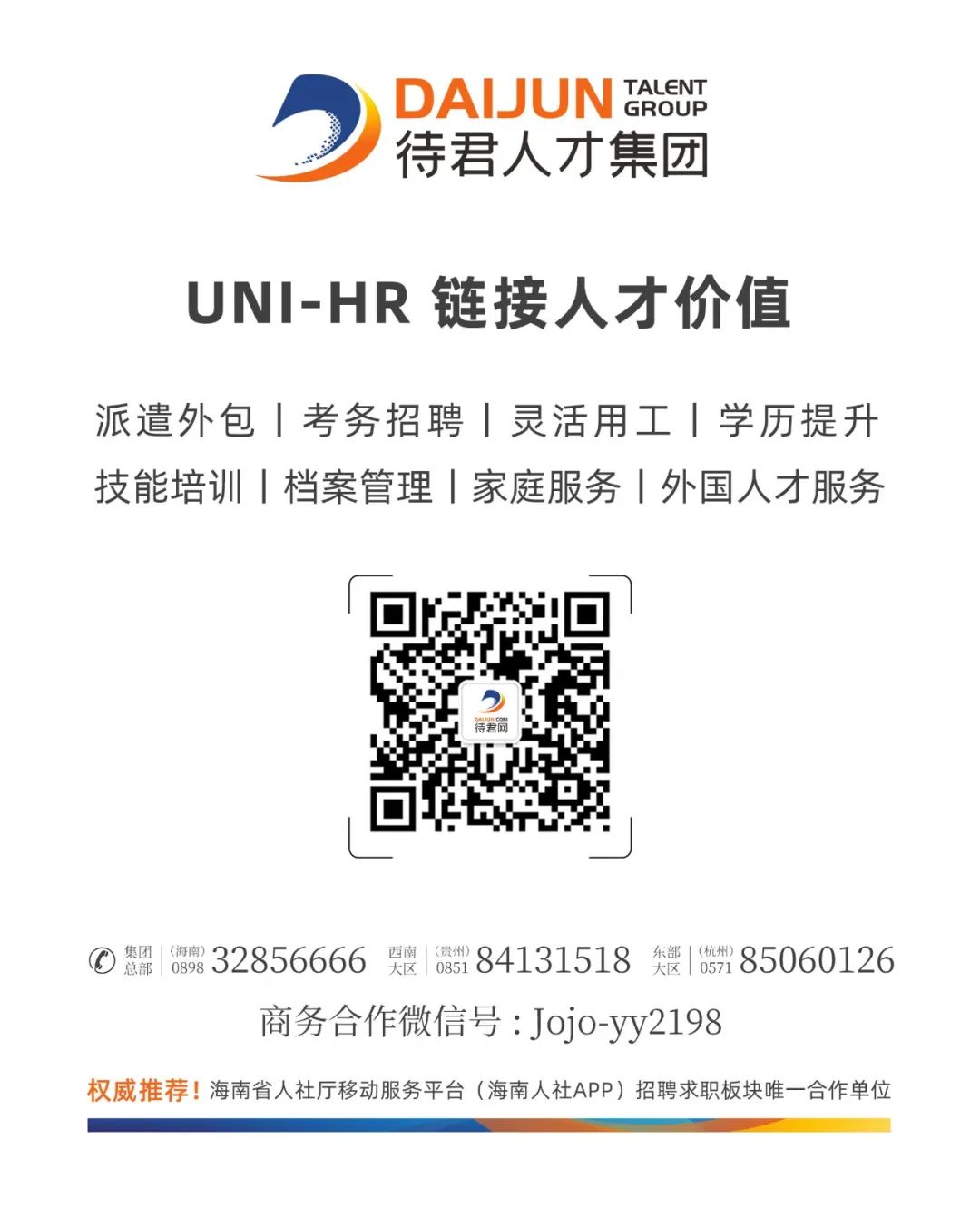 1.招聘事宜全程在待君网(www.daijun.com)公布,请务必提供准确的联系电话、通讯地址及邮箱并保持通讯渠道畅通。