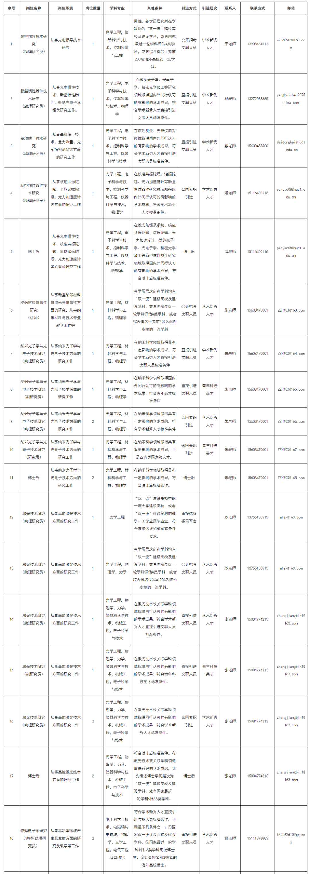 国防科技大学是一所综合性研究型大学,国家“双一流”建设高校,高素质新型军事人才培养和国防科技自主创新高地。国防科技大学前沿交叉学科学院主要承担光学工程、电子科学与技术等学科专业人才培养,承担激光陀螺、纳米光电子、高能激光、高功率微波等领域重大科研任务,推动半导体、量子、智能等新兴交叉学科培育和跨学科协同创新平台建设。拥有光学工程国家重点学科和物理电子学湖南省重点学科,一级学科博士学位授权点2个,博士后科研流动站1个,光学工程在第四轮全国一级学科水平评估中被评为A,“光电技术”学科群为学校三大特色优势学科群之一。