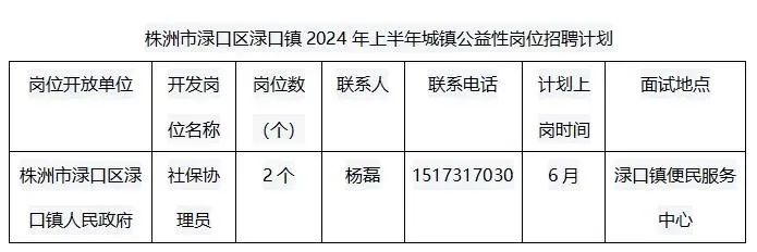 附件:株洲市渌口区渌口镇2024年上半年城镇公益性岗位招聘计划