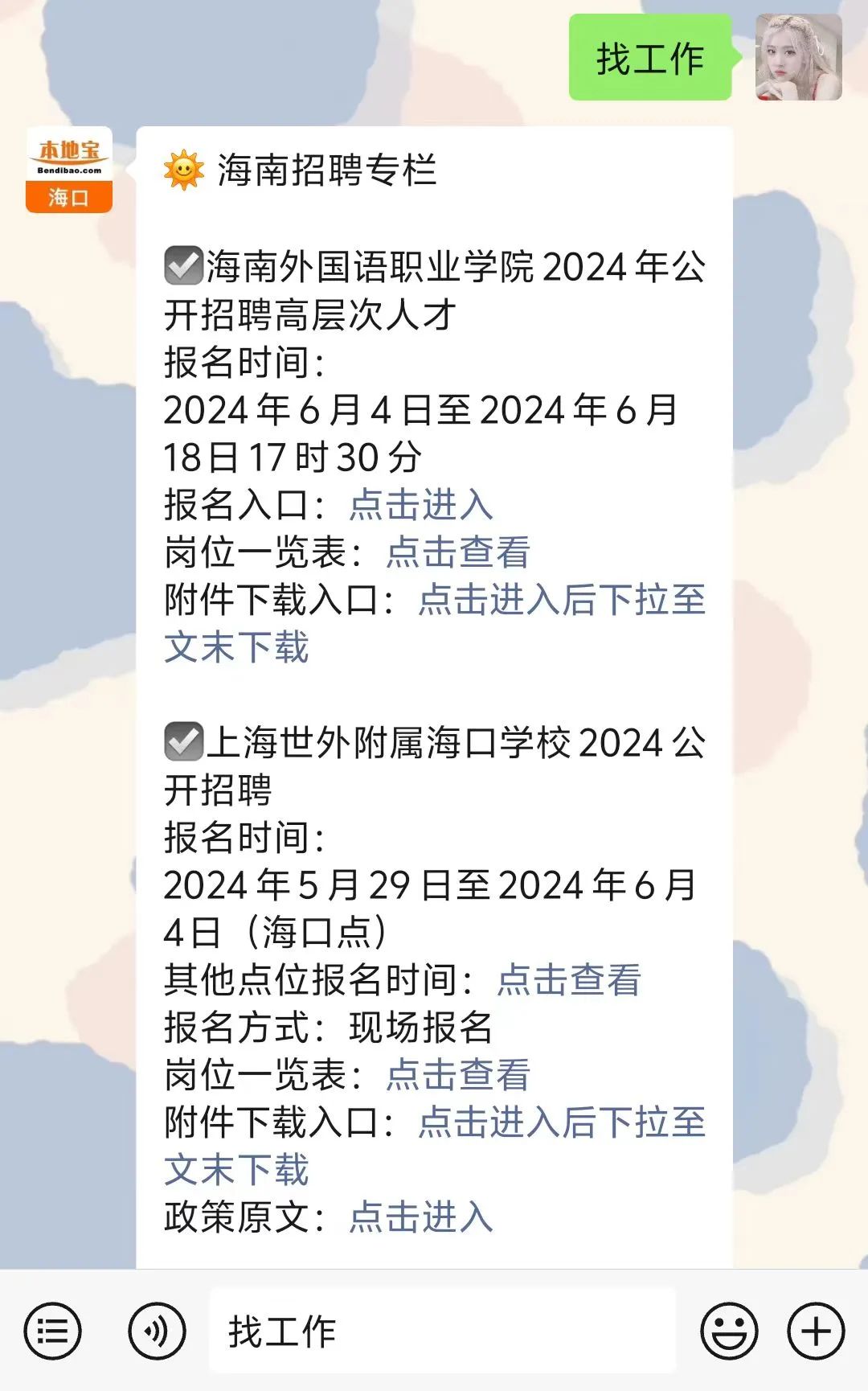 长按识别下方二维码,关注海口本地宝公众号,在后台回复【找工作】即可获取报名入口,查看最新公告,下载相关附件等。