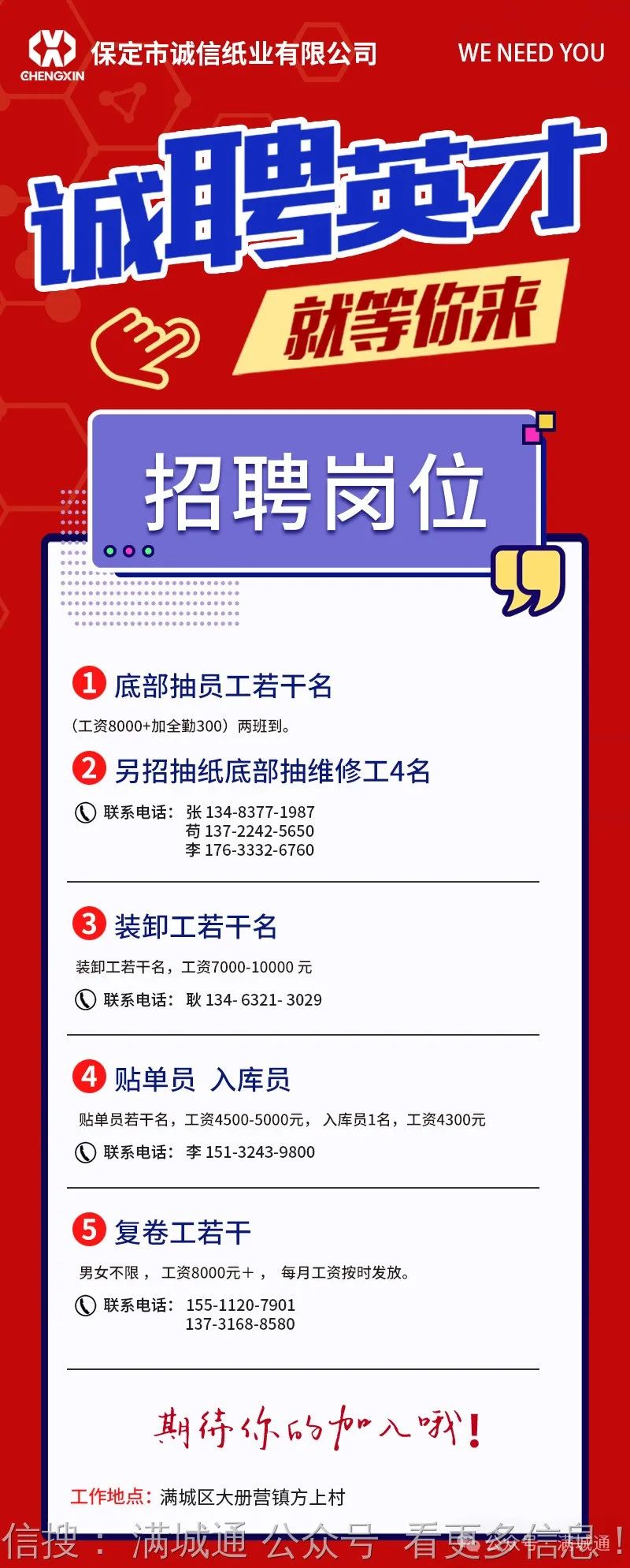 诚信纸业有限公司(满城区大册营)诚招以下岗位: