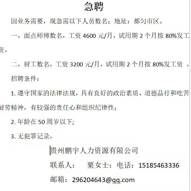 都匀集市招聘广告!都匀集市因工作需要,现招聘以下人员:一、售卖员人数: 40女10男要求: 18-40岁工作内容:协助摊位老板售卖各种小吃,看管游戏摊位,协助售票工作日期: 5月20日—6月1日工作时间:10:00-22:00工资待遇: 120,不包餐,100包两餐工作地点:都匀市茶博园联系方式:13252384555(微信同号)注: 加微信请备都匀提示:联系我时请说是在都匀招聘网上看到的优先录用!截止:5月24日