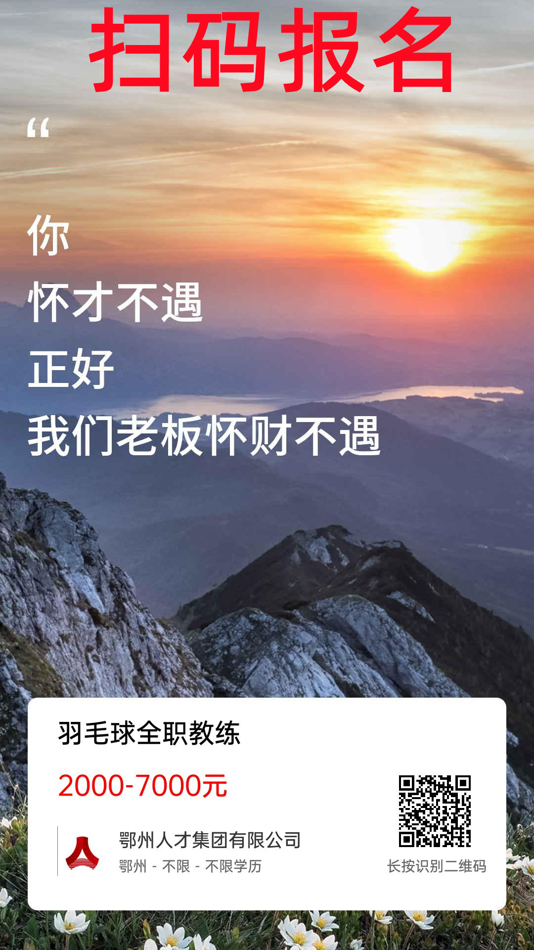 学历不限,50岁以下,底薪加提成,有一定羽毛球专业基础,会定点发高远球、网前球,能独立上羽毛球训练课,工作时间自由,有执教经验优先,工作地点位于鄂城区。