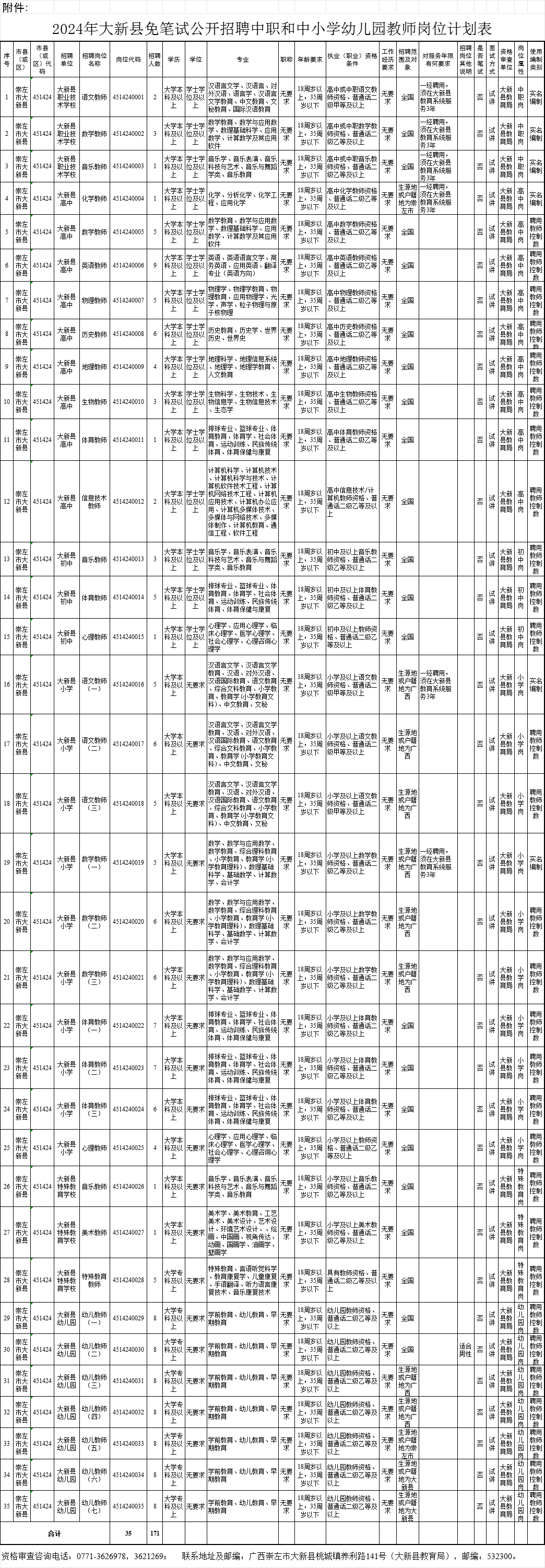 为进一步充实我县教师队伍,根据《自治区教育厅 自治区人力资源社会保障厅 自治区党委编办关于印发〈中小学教师公开招聘改革指导意见〉的通知》(桂教规范〔2019〕19号)精神,2024年崇左市大新县免笔试公开招聘中职和中小学幼儿园教师35个岗位,共招聘教师171名。现将有关事项公告如下: