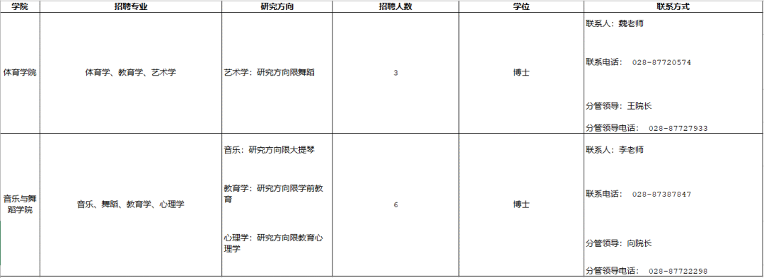 招聘专业:体育学、教育学、艺术学