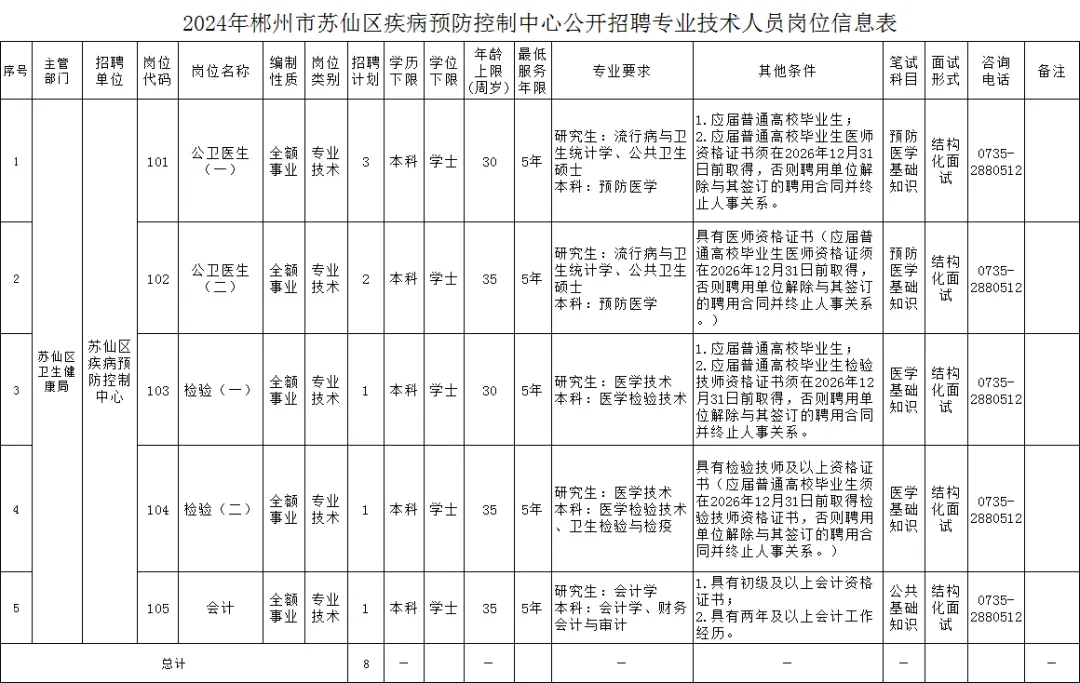 ▼关注郴州同城信息网——获取郴州招聘网、郴州人才网最新郴州市招聘信息,郴州找工作、郴州招聘上郴州同城招聘网。 2024年郴州市苏仙区疾病预防控制中心公开招聘专业技术人员公告根据《事业单位人事管理条例》(国务院令第652号)、《湖南省事业单位公开招聘人员办法》(湘人社发〔2019〕1号)、《关于进一步规范我省事业单位公开招聘考试工作的通知》(湘人社函〔2021〕37号)和《关于进一步改进事业单位公开招聘工作的通知》(郴组〔2016〕11号)等文件精神,经苏仙区委、区政府同意,2024年郴州市苏仙区疾病预防控制中心面向社会公开招聘专业技术人员8名,现公告如下:1.计划公开招聘专业技术人员8名,具体招聘岗位、人数及资格条件等详见《2024年郴州市苏仙区疾病预防控制中心公开招聘专业技术人员岗位信息表》(附件1)。2.招聘公告可通过以下网站查阅:郴州市人力资源和社会保障局门户网站(http://czrsj.czs.gov.cn)、郴州人力资源考试网(http://61.187.189. 252)、苏仙区政府门户网(http://www.hnsx.gov.cn)。3.招聘各环节相关信息指定在苏仙区政府门户网站发布。6.符合招聘岗位所需的年龄、学历、学位、专业、资格证书和其他条件,详见《2024年郴州市苏仙区疾病预防控制中心公开招聘专业技术人员岗位信息表》(附件1)。(1)招聘岗位要求30周岁及以下的,即1993年5月21日以后出生;35周岁及以下的,即1988年5月21日以后出生。(2)报考人员的学历(学位)必须为国家承认的学历(学位)。对有疑义的国民教育学历(学位),以省以上教育行政部门认定的结果为准;对有疑义的党校学历(学位),以省委组织部协调相关业务主管部门认定的结果为准。(3)报考人员的专业应严格按照毕业证书的专业名称(全称)填写。报考专业及专业类参考《湖南省2024年考试录用公务员专业指导目录》(附件5)、《普通高等学校本科专业目录(2020年)》(附件6)、《普通高等学校研究生专业目录(2012年)》(附件7)。所学专业或专业类已列入上述目录但未列入招聘岗位专业或专业类要求的,不符合报考条件;所学专业未列入上述目录的,由招聘单位主管部门认定。(4)面向应届普通高校毕业生报考的岗位仅限以下人员报考:未落实工作单位的2022届、2023届、2024届全日制高校毕业生(包括2017年起国家统招的非全日制研究生)。截至2024年5月,已是机关事业单位在编在岗的2022届、2023届、2024届全日制高校毕业生(包括2017年起国家统招的非全日制研究生)为已落实工作单位人员,不得报考面向应届普通高校毕业生报考的岗位。(5)应届普通高校毕业生报考人员的学历(学位)证书、国(境)外留学人员学历认证须在2024年7月31日前取得,未在规定时间取得学历(学位)证书,资格审查不合格,取消聘用资格;应届普通高校毕业生报考人员的医师资格证、检验技师资格证须在2026年12月31日前取得,未按时取得相应资格证书的,聘用单位解除与其签订的聘用合同并终止人事关系。(6)岗位要求中工作经历的计算时间截止至2024年5月,年限按足年足月计算。1.曾因犯罪受过刑事处罚的人员或曾被开除公职的人员;2.尚未解除党纪、政纪处分或正在接受纪律审查或监察调查的人员;3.涉嫌违法犯罪正在接受司法调查尚未作出结论的人员;4.在各级各类事业单位公开招聘中因违反《事业单位公开招聘违纪违规行为处理规定》被记入事业单位公开招聘应聘人员诚信档案库,且记录期限未满的人员;6.截止公告发布之日,试用期内的机关事业单位工作人员和未满最低服务年限的机关事业单位工作人员;7.在读的普通高校全日制非2024届毕业生(在读的全日制非2024届研究生不能以本科等学历报考,其他情形依此类推);9.报考人员不得报考聘用后即构成应回避关系的招聘岗位;10.法律、政策规定不得聘用为事业单位工作人员的其他情形的人员。招聘工作按照现场报名、现场资格审查、笔试、面试、体检、考察、公示、聘用等程序进行。1.方式:本次招聘采取现场报名方式进行,不收取报名费,报名2.时间:2024年5月29日-5月31日(上午8:30-12:00,下午14:30-18:00)。3.地点:苏仙区疾病预防控制中心7楼会议室(704室)(郴州市福源路5号,市内乘38、39路公交车到观山学校公交车站台下车左转300米即到)。4.领取准考证。请考生于2024年6月7日-6月8日(上午8:30-12:00,下午14:30-18:00)凭有效身份证件到苏仙区疾病预防控制中心办公室(703室)领取准考证。如代领准考证的必须提供代领人的身份证原件、复印件以及报考人的身份证复印件、委托书。准考证请保留到聘用结束之后。(1)本次招聘考试要求报考人员只能选择一个岗位报名,报名与考试必须使用有效身份证件(二代有效身份证件、有效期内的临时身份证、带本人照片的户籍证明,下同)。报考人员须认真对照附件1,根据自身条件,正确选择合适岗位,准确填报本人报名信息。报名后,报考人员不得更改个人信息和报考岗位。电子身份证不作为本次考试的有效证件。(2)笔试最低开考比例为1:3。达不到开考比例的,由苏仙区卫生健康局提出申请,经苏仙区人力资源和社会保障局批准后,可降低开考比例至1:2。实际参考人数未达到开考比例的岗位,笔试成绩必须达到本次招聘考试同一科目全体有效参考人员笔试成绩的平均分才能入围面试。(3)未达到笔试最低开考比例取消招聘计划数的岗位,将于2024年5月31日在苏仙区政府门户网站公布。报考