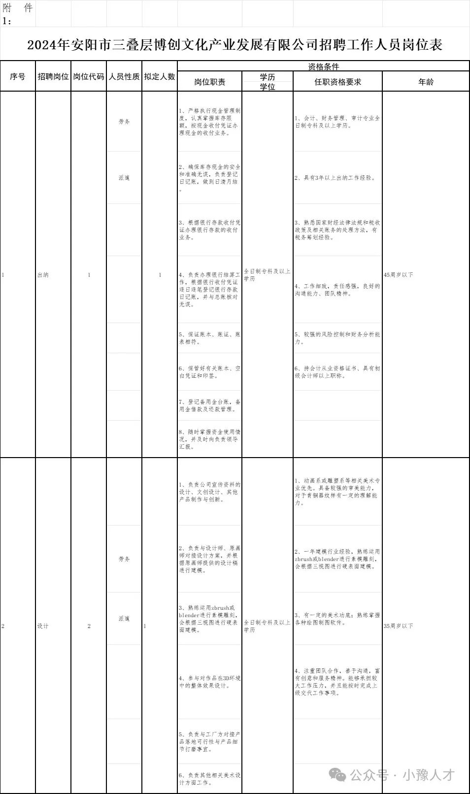 各职位要求详见《2024年安阳市三叠层创文化产业发展有限公司招聘工作人员岗位表》。