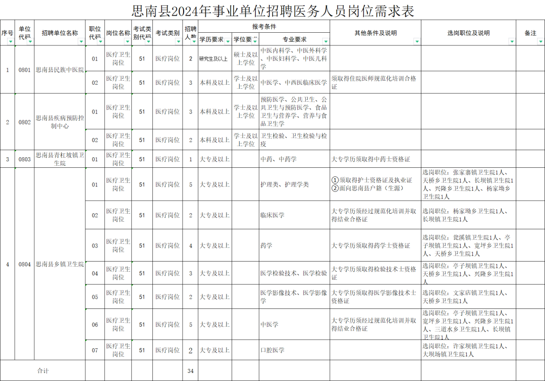 本次计划招聘事业单位医务人员34人,其中:县直医疗卫生机构10人、乡镇卫生院24人。具体招聘单位、岗位及要求详见《思南县2024年事业单位招聘医务人员岗位需求表》(以下简称“岗位表”)。