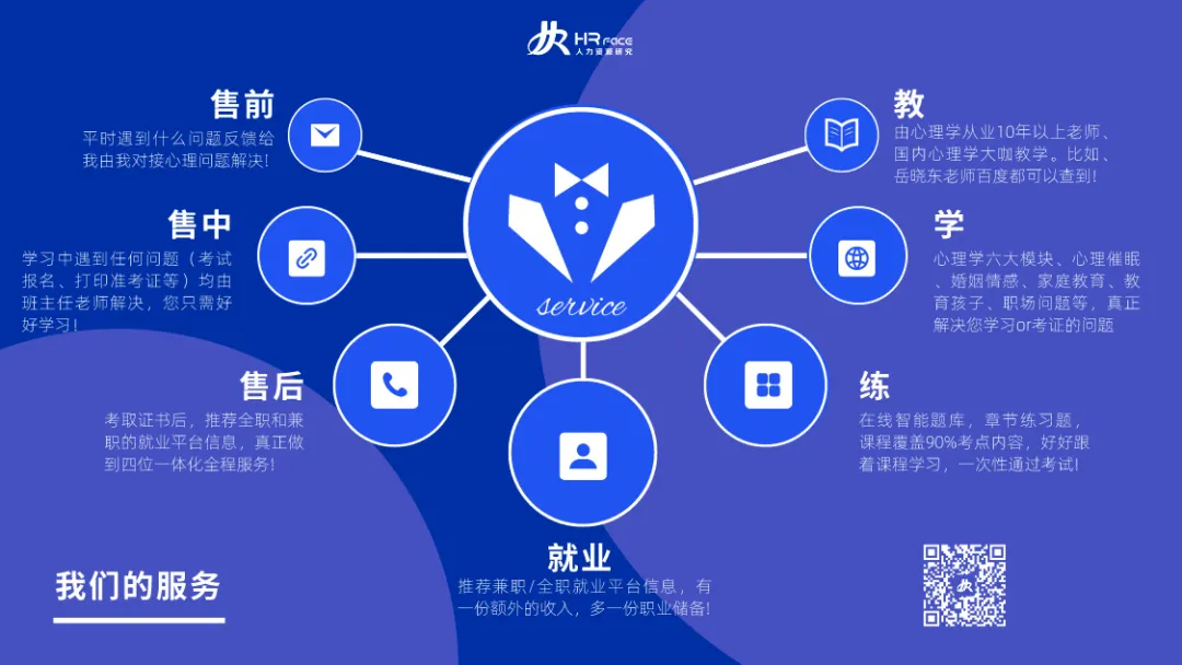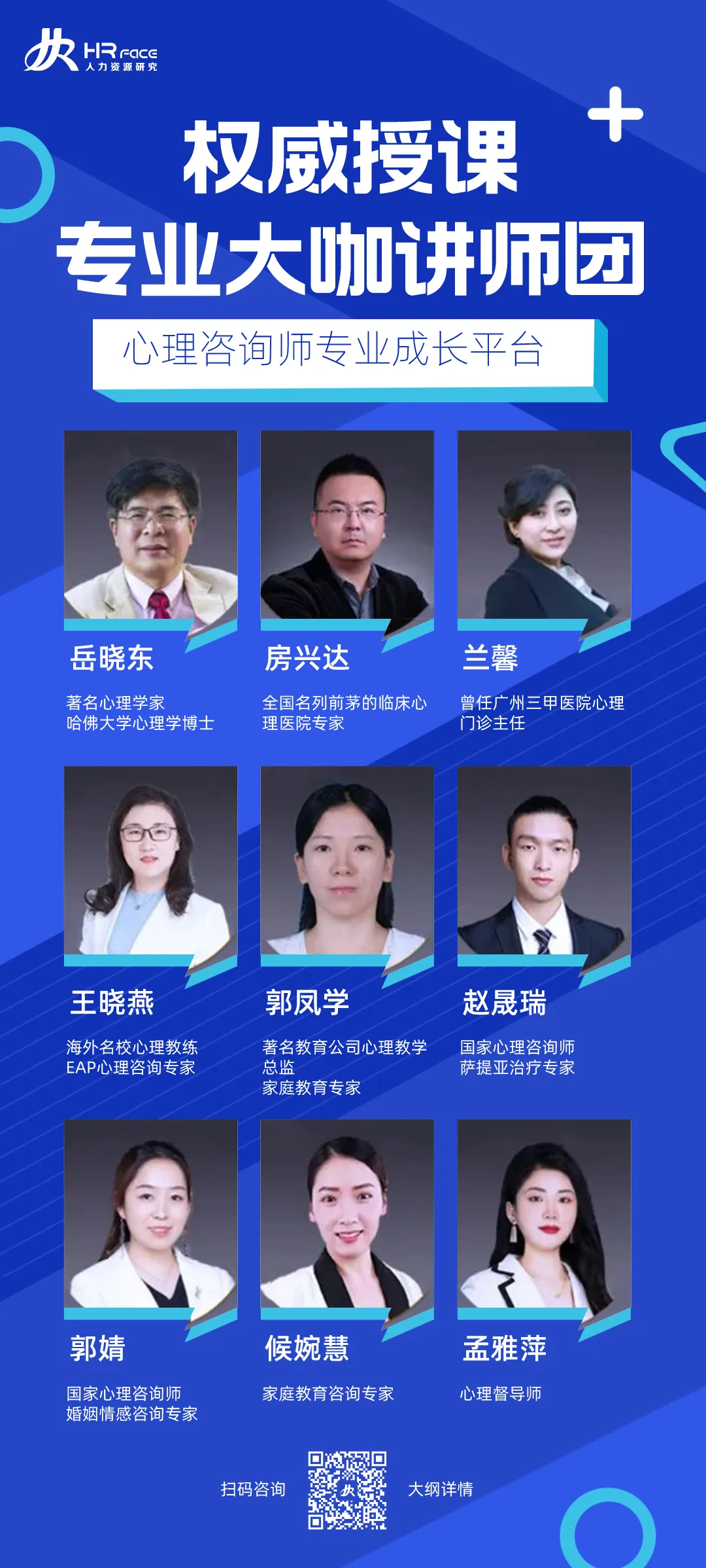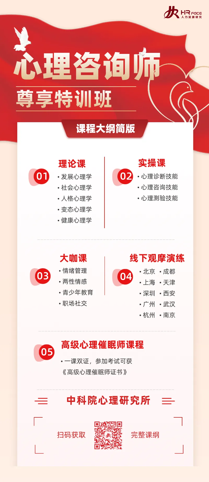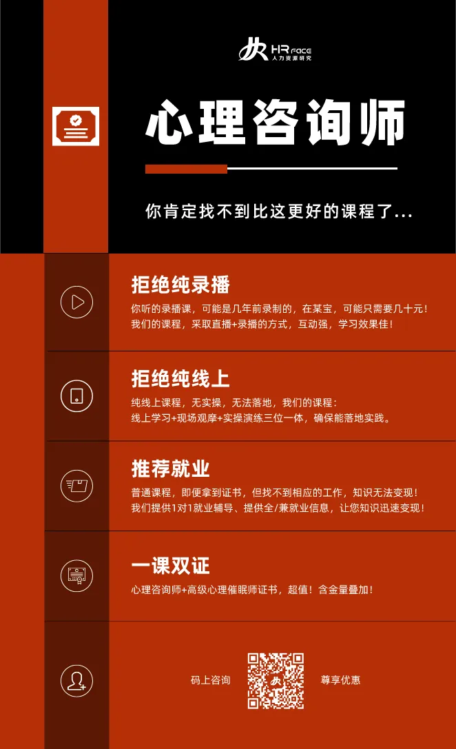 看到这里,相信各位HR对心理学充满了好奇,如果你需要更多关于心理学的知识来帮助你在职场上发光发亮的话,不如看看研究君今天要推荐的心理咨询师尊享特训班。课程里面包含了理论课、实操课、大咖课、线下观摩演练课以及高级心理催眠师课程五大课程。直播理论课包含发展心理学、社会心理学、人格心理学、变态心理学以及健康心理学,课程详细内容可翻阅查看课程大纲。理论之后开始实操学习(观摩学习),实操学习包括心理诊断技能、心理咨询技能、心理测验技能等。▲扫码获取详细课纲▲