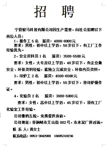 工作地点:青铜峡小坝第七中学东侧七彩幼儿园对面(至善养老院)