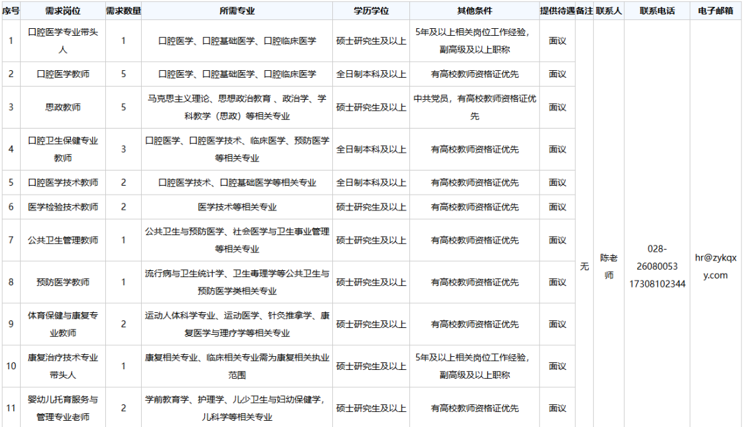 本次招聘岗位包括口腔医学专业带头人,口腔医学教师、口腔医学技术教师、基础医学教师、智能医疗装备技术专业教师 、医疗器械经营与管理专业教师等28个岗位,详见《资阳口腔职业学院招聘岗位一览表》(附件1)。