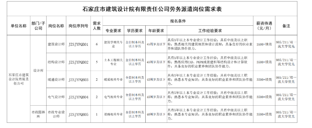 根据工作需要,石家庄市建筑设计院有限责任公司特委托石家庄市国经人力资源管理有限公司面向社会公开招聘劳务派遣制人员16名。现将具体招聘流程设定如下: