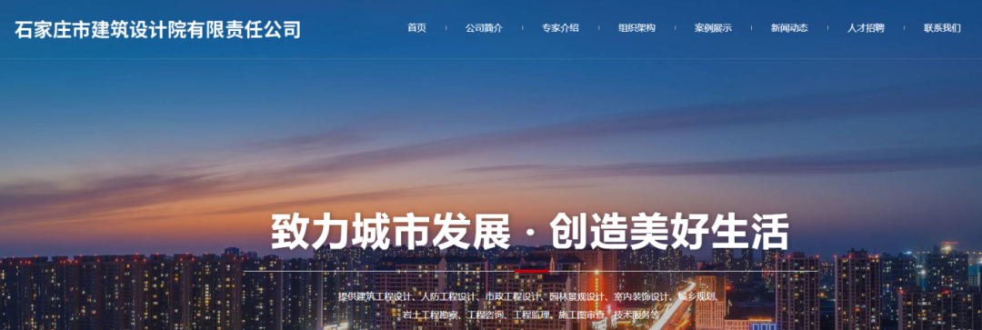 石家庄市建筑设计院有限责任公司创建于1958年,是全省同行业中成立时间较早、专业较全、规模较大的国有甲级建筑设计院之一,现为石家庄国控城市发展投资集团有限责任公司二级子公司。