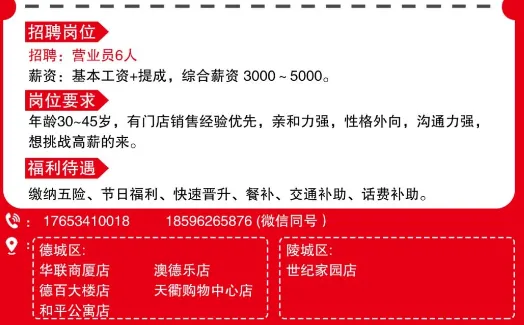 待遇:底薪+提成+店铺奖励 综合3400-5000