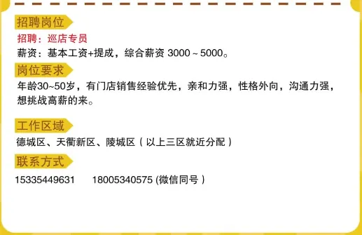 要求40岁以下,大专以上(能力强可放宽限制),熟悉德州本地食品市场的分布,熟悉各常规餐饮类APP、小程序的运营与规则;深入了解德州家庭选购率高、复购率高的相关食品类商品品牌和价格