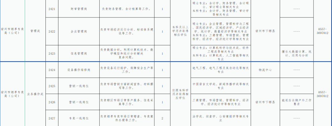 本次招聘计划共106人,其中管理类岗位41人,业务操作类岗位65人。招聘单位、岗位、学历及专业等需求详见《安徽省烟草专卖局(公司)2024年度招聘需求表》(附件1)。