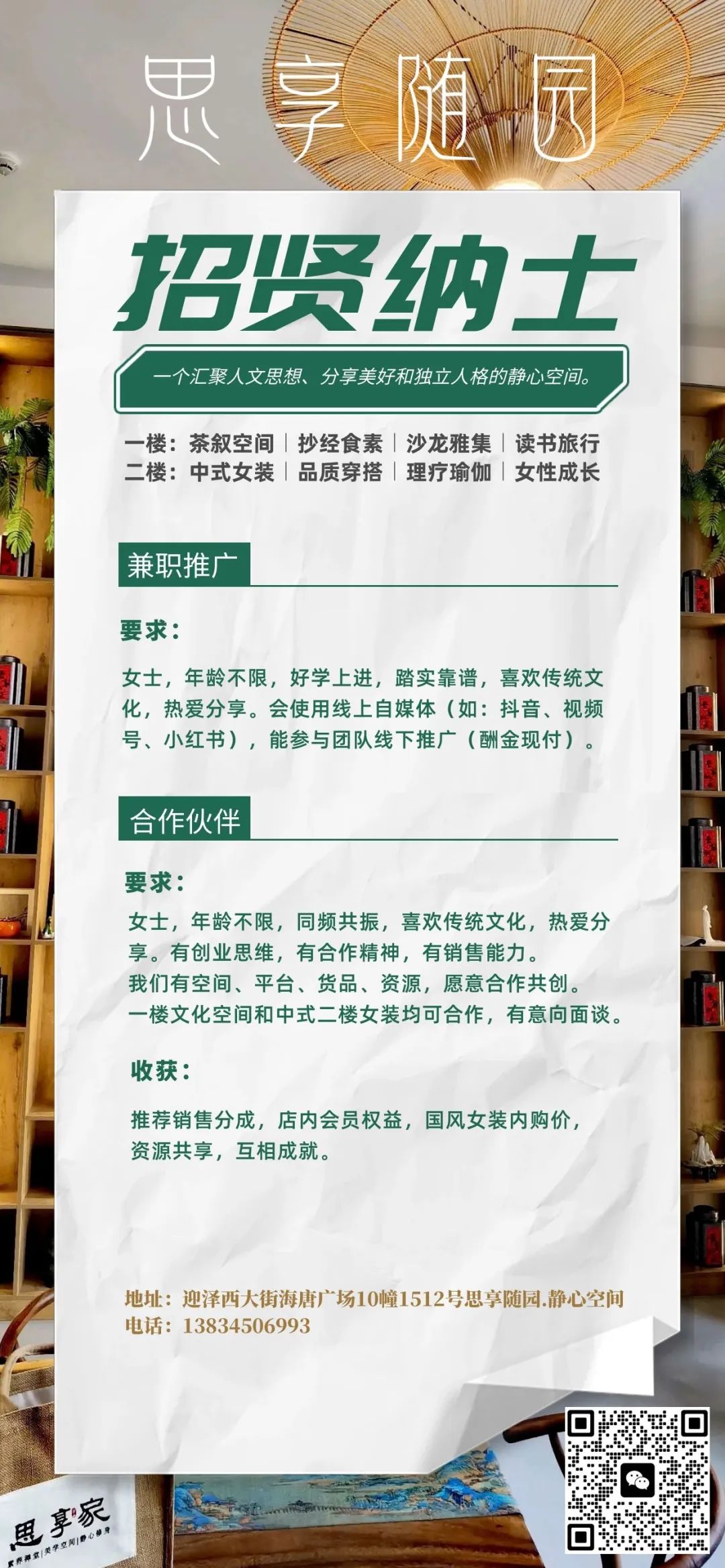 要求:女,22-50岁,喜欢穿搭,有销售能力,会玩自媒体,喜欢中式国风,愿意合作共创。我提供空间平台货源,你来销售推广,合作分成,详情面谈。
