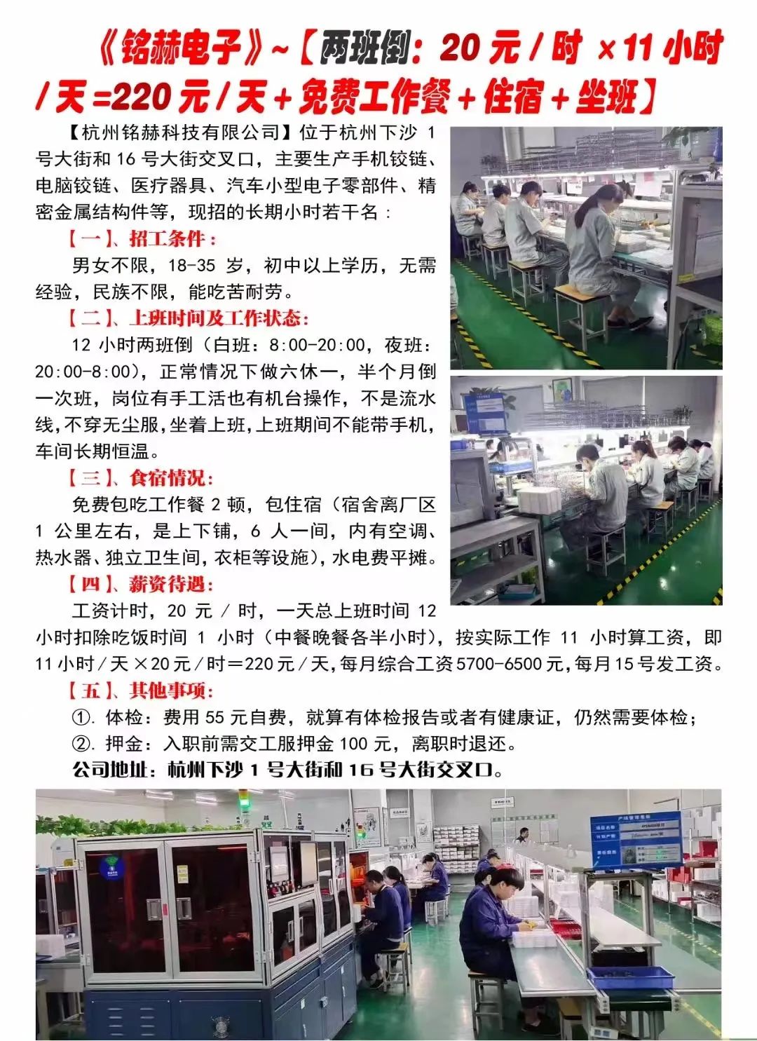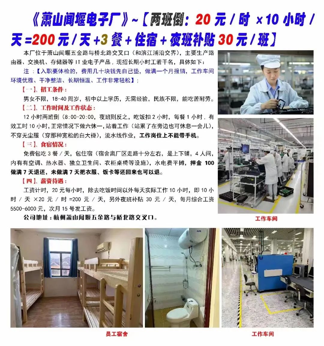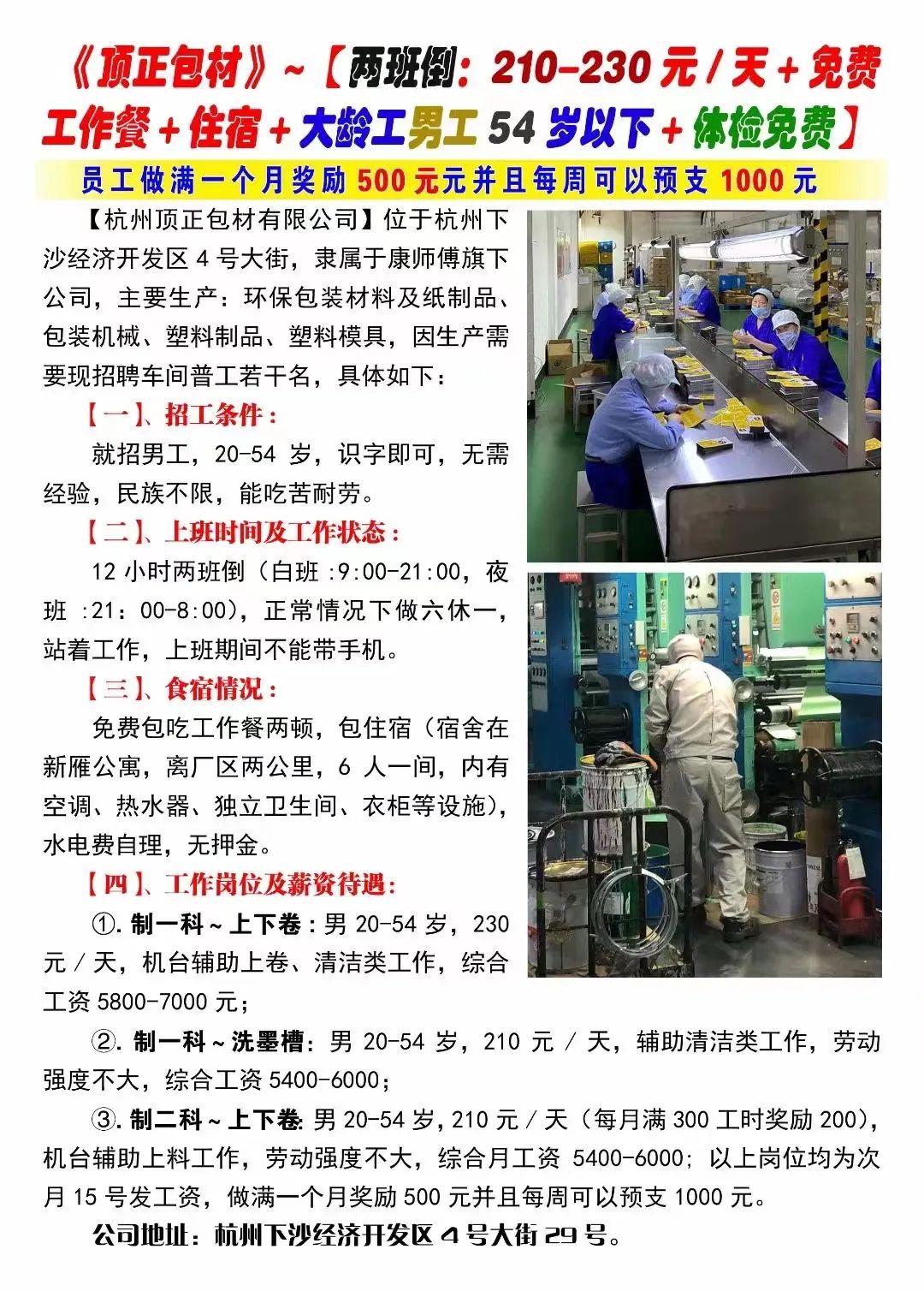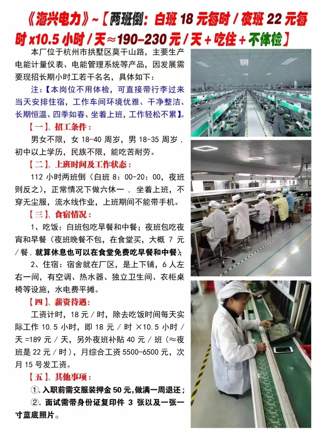 【两班倒:210-230元/天+免费作工餐+住宿+检体免费】月薪5500-6500,招就男工20-54岁,工作日每天试面,当安天排住宿!【两倒班:20元/时×11工时/天=220元/天+班坐+吃住】月薪5700-6500,男女1:1,18-35岁,工作日面试!【白长班:18元/时×12时/天=216元每天+坐班+3餐+宿住】月薪5600-6500,男女不限,16-42岁,作工日试面,当天安排住宿!下沙集有合车送的(车费50元)!12时小两班:月薪7000-10000,男女不限,男18-45岁周,女18-38周岁,4.8号面试!一 年龄18 周岁-35 周岁,女工,积极进取、责任心强、勤奋好学,心态好,2、身体健康,无色弱、色盲,无精神病史,无纹身,无传染病及不良嗜好。2、上班时间:两班制,早8:30-20:30,晚20:30一次日8:30,月休4 天左右;1、公司提供设有食堂,提供餐补,入职即可享受300元公司餐补2、公司建有免费员工公寓,4人/间;内设空调、网络、卫生间、淋浴房且 24 小时提供热水洗浴和饮用开水;3享受六险-金(养老、医疗、工伤、生育、失业及商业保险、住房公积金五、享受夜班补贴(60元/班)、全勤奖、过节福利、健康体检、员工旅游、季度劳保、高温费、内部推荐奖等等;7、公司提供多项内部培训及外部培训机会;注重员工职业规划,大专及以上学历的员工制定相应的晋升通道;8、季度奖、半年奖、年终奖、创新奖、评先等各类奖金。9、享受夜班补贴、全勤奖、过节福利、健康体检、员工旅游、季度劳保、高温费,初中学历,能接受穿无尘服,手腕和手面不能有纹身,不能掉皮,体重不能超过130.10-12小时早班:8:00-20:00,中班:16:00-1:30,最迟加班到凌晨3:30.左右前6个月:基础单价21/小时+0~2元/小时考核奖金(大部分拿到1元奖金),单价23/小时+0~2元/小时考核奖金(大部分拿到1元奖金),考核奖金每月直接发放,月综合工资5500-6500元,工龄越长工资越高,全年免费吃住(水电费不扣,全免费)。夫妻工,可以安排夫妻房《工作要求》:女年龄18—47周岁,男生要求不吸烟,无纹身《薪资待遇》:200元+绩效奖金额外核算综合工资5500~6500元/月,免费工作两餐,包住,(不扣水电费,有独立卫生间,空调和热水器),在职每月15号发工资。《工作时间》:早7点上班,晚7点下班,12小时倒班制接料员:负责把岗位上的调料包接料。把第一筐的最后一袋和第二筐的第一袋用胶带连接起来。只要不断料、不接错料包就可以物料员:拉碗备料的工作。车间和仓库同一楼层、在仓库把物料用地牛拉到车间岗位上。不是流水线、工作有忙有闲不住宿下沙范围免费班车接送(如:智格,七格,八堡,九堡,世贸,伊莎卡,保利东湾,星星港湾等小区) 松下厨房、长白班小时工★长白班+20元/时+长小期时工+包吃住★时间:长白班,一般8:30-20:30,做六休一。薪资待遇:20元/时×11-12时/日×26天 /月≈5500-6500元。培训期税前工资:200元/天,月综合薪资4500元(培训期一般为30天,表现优异可缩短培训期,直接进入见习期)见习期税前工资:综合薪资4700元,底薪(2510-2800不等)转正后税前工资:综合薪资5900-6500元,底薪(2800-3200不等)(综合收入与话务量及话务质量相关,非电话销售,无业绩压力)缴纳杭州五险。要求:高中及以上学历,男女不限18-35周岁,无口音、咬字清晰、1分钟电脑打字30字以上。