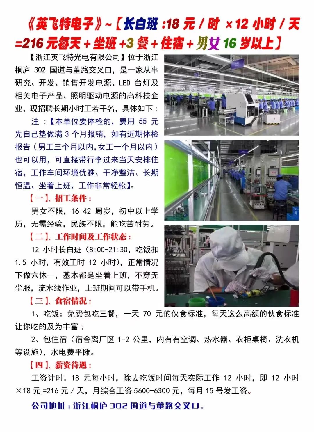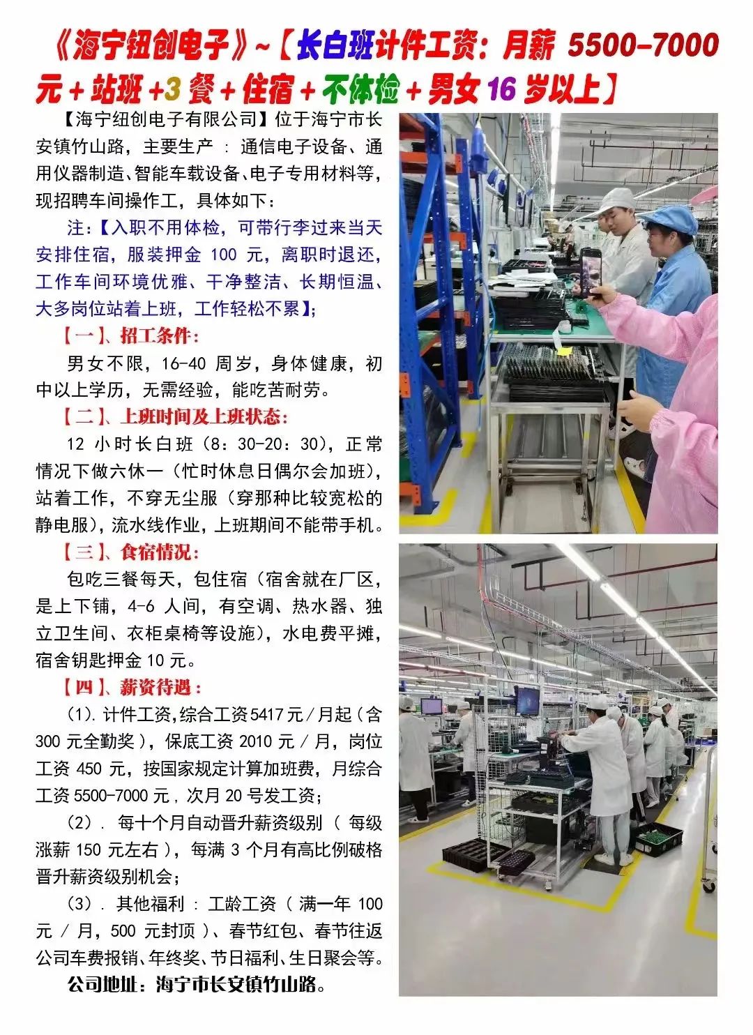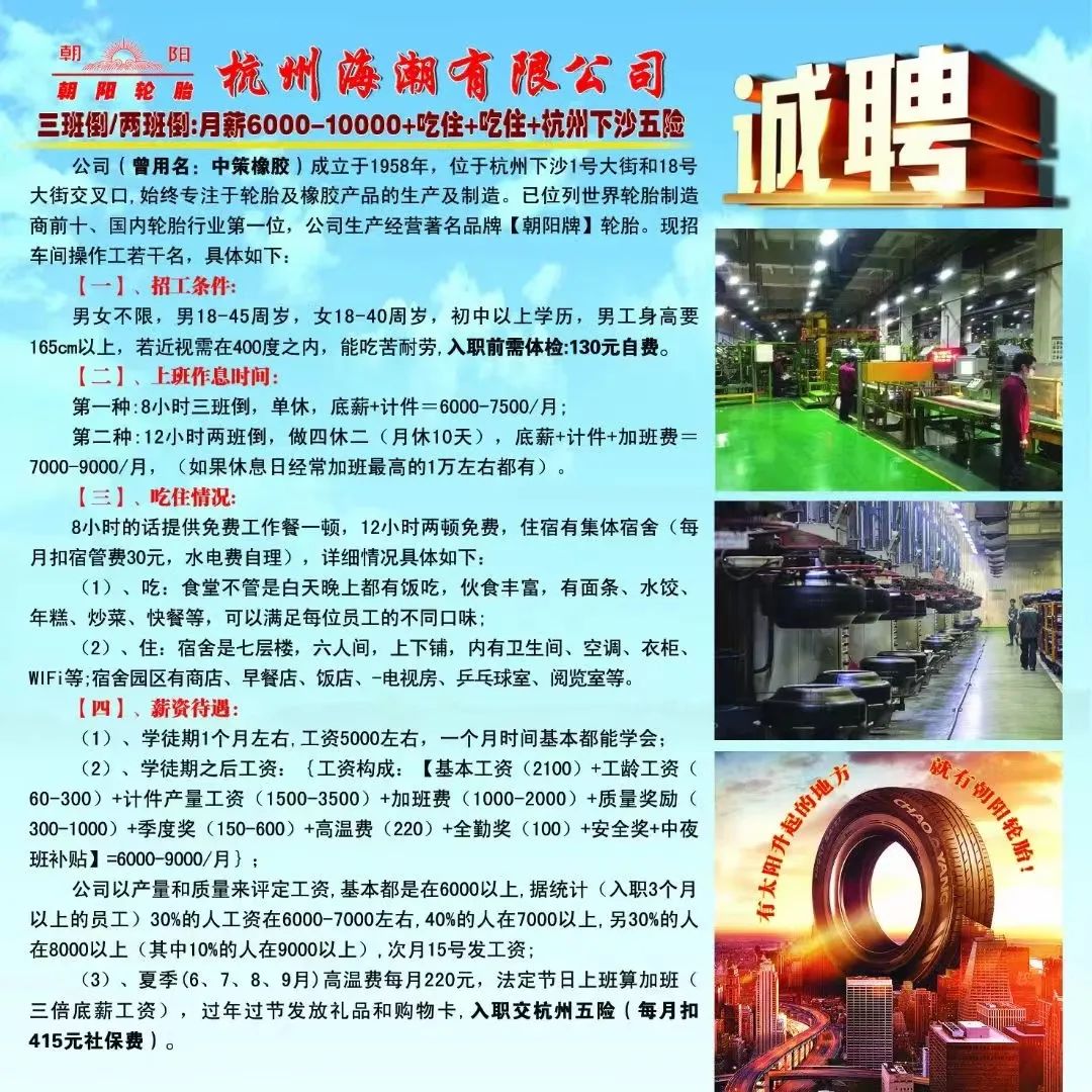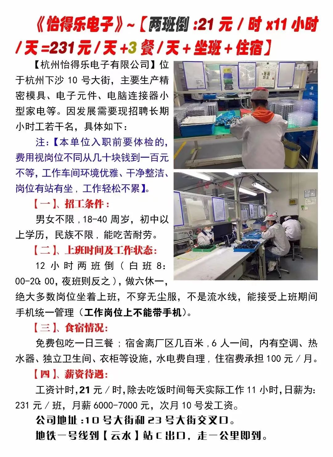 【两班倒:210-230元/天+免费作工餐+住宿+检体免费】月薪5500-6500,招就男工20-54岁,工作日每天试面,当安天排住宿!【两倒班:20元/时×11工时/天=220元/天+班坐+吃住】月薪5700-6500,男女1:1,18-35岁,工作日面试!【白长班:18元/时×12时/天=216元每天+坐班+3餐+宿住】月薪5600-6500,男女不限,16-42岁,作工日试面,当天安排住宿!下沙集有合车送的(车费50元)!12时小两班:月薪7000-10000,男女不限,男18-45岁周,女18-38周岁,4.8号面试!一 年龄18 周岁-35 周岁,女工,积极进取、责任心强、勤奋好学,心态好,2、身体健康,无色弱、色盲,无精神病史,无纹身,无传染病及不良嗜好。2、上班时间:两班制,早8:30-20:30,晚20:30一次日8:30,月休4 天左右;1、公司提供设有食堂,提供餐补,入职即可享受300元公司餐补2、公司建有免费员工公寓,4人/间;内设空调、网络、卫生间、淋浴房且 24 小时提供热水洗浴和饮用开水;3享受六险-金(养老、医疗、工伤、生育、失业及商业保险、住房公积金五、享受夜班补贴(60元/班)、全勤奖、过节福利、健康体检、员工旅游、季度劳保、高温费、内部推荐奖等等;7、公司提供多项内部培训及外部培训机会;注重员工职业规划,大专及以上学历的员工制定相应的晋升通道;8、季度奖、半年奖、年终奖、创新奖、评先等各类奖金。9、享受夜班补贴、全勤奖、过节福利、健康体检、员工旅游、季度劳保、高温费,初中学历,能接受穿无尘服,手腕和手面不能有纹身,不能掉皮,体重不能超过130.10-12小时早班:8:00-20:00,中班:16:00-1:30,最迟加班到凌晨3:30.左右前6个月:基础单价21/小时+0~2元/小时考核奖金(大部分拿到1元奖金),单价23/小时+0~2元/小时考核奖金(大部分拿到1元奖金),考核奖金每月直接发放,月综合工资5500-6500元,工龄越长工资越高,全年免费吃住(水电费不扣,全免费)。夫妻工,可以安排夫妻房《工作要求》:女年龄18—47周岁,男生要求不吸烟,无纹身《薪资待遇》:200元+绩效奖金额外核算综合工资5500~6500元/月,免费工作两餐,包住,(不扣水电费,有独立卫生间,空调和热水器),在职每月15号发工资。《工作时间》:早7点上班,晚7点下班,12小时倒班制接料员:负责把岗位上的调料包接料。把第一筐的最后一袋和第二筐的第一袋用胶带连接起来。只要不断料、不接错料包就可以物料员:拉碗备料的工作。车间和仓库同一楼层、在仓库把物料用地牛拉到车间岗位上。不是流水线、工作有忙有闲不住宿下沙范围免费班车接送(如:智格,七格,八堡,九堡,世贸,伊莎卡,保利东湾,星星港湾等小区) 松下厨房、长白班小时工★长白班+20元/时+长小期时工+包吃住★时间:长白班,一般8:30-20:30,做六休一。薪资待遇:20元/时×11-12时/日×26天 /月≈5500-6500元。培训期税前工资:200元/天,月综合薪资4500元(培训期一般为30天,表现优异可缩短培训期,直接进入见习期)见习期税前工资:综合薪资4700元,底薪(2510-2800不等)转正后税前工资:综合薪资5900-6500元,底薪(2800-3200不等)(综合收入与话务量及话务质量相关,非电话销售,无业绩压力)缴纳杭州五险。要求:高中及以上学历,男女不限18-35周岁,无口音、咬字清晰、1分钟电脑打字30字以上。