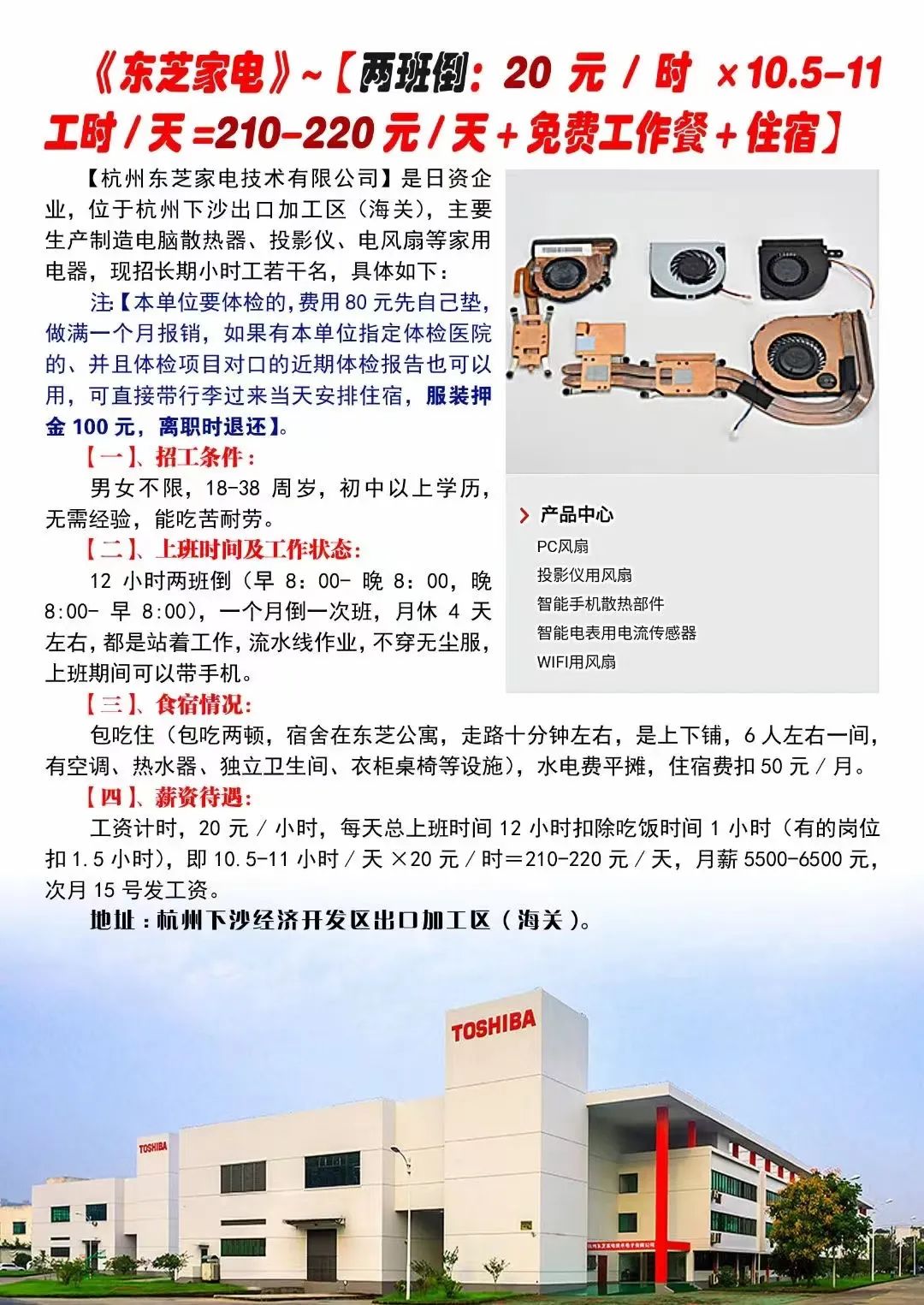 (1)工资220/天,做不满一个月按200发放,节假日按照国家规定正常三倍工资发放(515一天),初中以上学历,无需经验,能吃苦耐劳(2)12小时班两倒(白班:早08:30-晚20: 30,夜班:晚20:30-早08:30),一个月倒一次班,每周单休主要工作是负责公司塑料产品包装、封箱、打包等工作。工资计时,每月平均工资6500-7200元,每月18号发工资。(3)、免费提供工作餐,供提集体宿舍(住宿6人左右一间,有空调、热水器、独立生卫间、衣柜、等设施)。注:智格、七格、八堡、乔司、星港星湾都有免费班车。面试不能穿拖鞋,短裙。