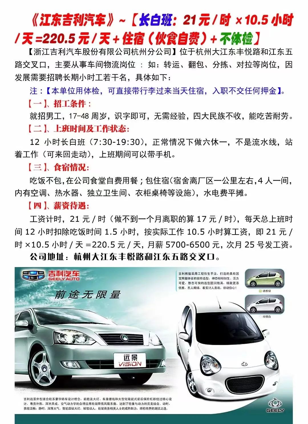 《江东吉汽利车》~【白长班:21元/时×10.5小时/天=220.5元/天+宿住(伙食自费)+不体检】薪月5700-6500,就招男工,17-48岁,作工日每天面试,当天安排住宿!