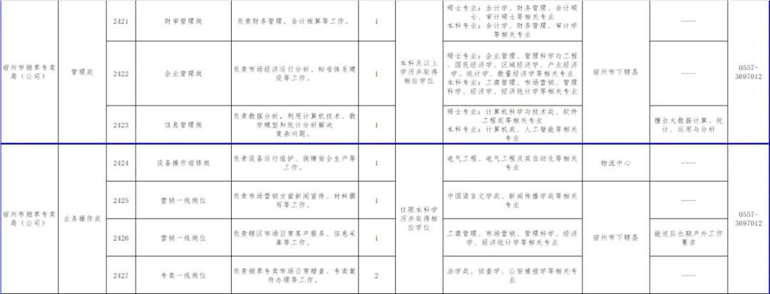 本次招聘计划共106人,其中管理类岗位41人,业务操作类岗位65人。招聘单位、岗位、学历及专业等需求详见《安徽省烟草专卖局(公司)2024年度招聘需求表》(附件1)。