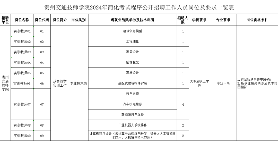 具体招聘岗位及要求见《贵州交通技师学院2024年简化考试程序公开招聘工作人员岗位及要求一览表》(附件1)。