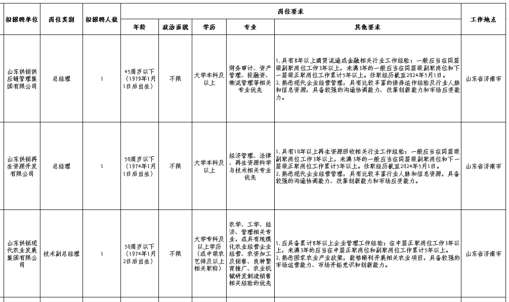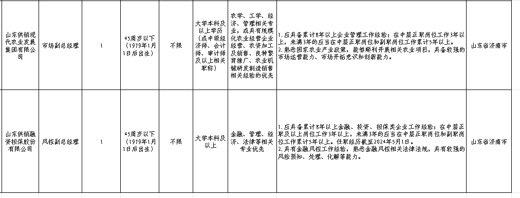 1.具有良好的政治素质和思想道德品质,较强的事业心及责任心,遵纪守法,坚持原则、廉洁自律,发展潜力大,履职记录良好,作风严谨细致,热爱三农和供销事业。2.具有敬业精神和职业道德操守,严格遵守法律法规,坚持原则,廉洁自律,作风严谨,行事稳健。3.中共党员和拥有国有企业、事业单位管理经验者优先考虑。4.对特别优秀或工作特殊需要的人才,可以适当放宽任职资格条件。报名方式:将附件2报名表发送至邮箱,邮箱:sd_coop@163.com,文件命名“姓名+报名岗位”。报名时,请务必完整填写各项内容,并附身份证、学历学位证书、工作经历证明等有关证明材料电子版,有个人简历可另附。根据岗位资格条件,对应聘者提交的报名材料进行资格审查和初步筛选。对符合职位要求并通过初步筛选的,将通过电话、短信或邮件等方式通知,未通过者不再另行通知。面试采用半结构化面试方式,具体面谈及面试时间、地点等另行通知。公司对拟聘人选进行考察、体检,考察内容包括工作表现、党风廉政及档案审核等情况,如不合格,则按面试结果依次递补或暂时空缺。根据应聘人员面试成绩、考察及体检情况,择优确定拟录用人员。被录用人员的薪酬待遇按照山东省供销集团有限公司相关制度执行。1.应聘者应对报名材料的真实性负责,凡弄虚作假者,一经查实,立即取消应聘及聘用资格。2.具有以下情形之一的,不得报名:因犯罪受过刑事处罚的人员;被开除中国共产党党籍的人员;被开除公职的人员;被依法列为失信联合惩戒对象的人员;因个人原因造成国有资产重大经济损失或恶劣影响的人员以及其他不适宜人员。3.公司有权根据岗位需求变化及报名情况等因素,调整、取消或终止岗位招聘工作。4.未尽事宜,请联系:0531-86968307。(报名表等可通过下方“便捷通道”快速获取)