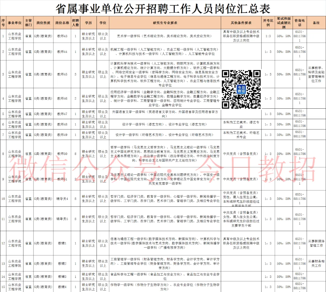 根据事业单位公开招聘有关规定,结合工作需要,山东农业工程学院拟面向社会公开招聘中初级专业技术岗位工作人员40人,岗位及条件详见《省属事业单位公开招聘工作人员岗位汇总表》(附件1)。