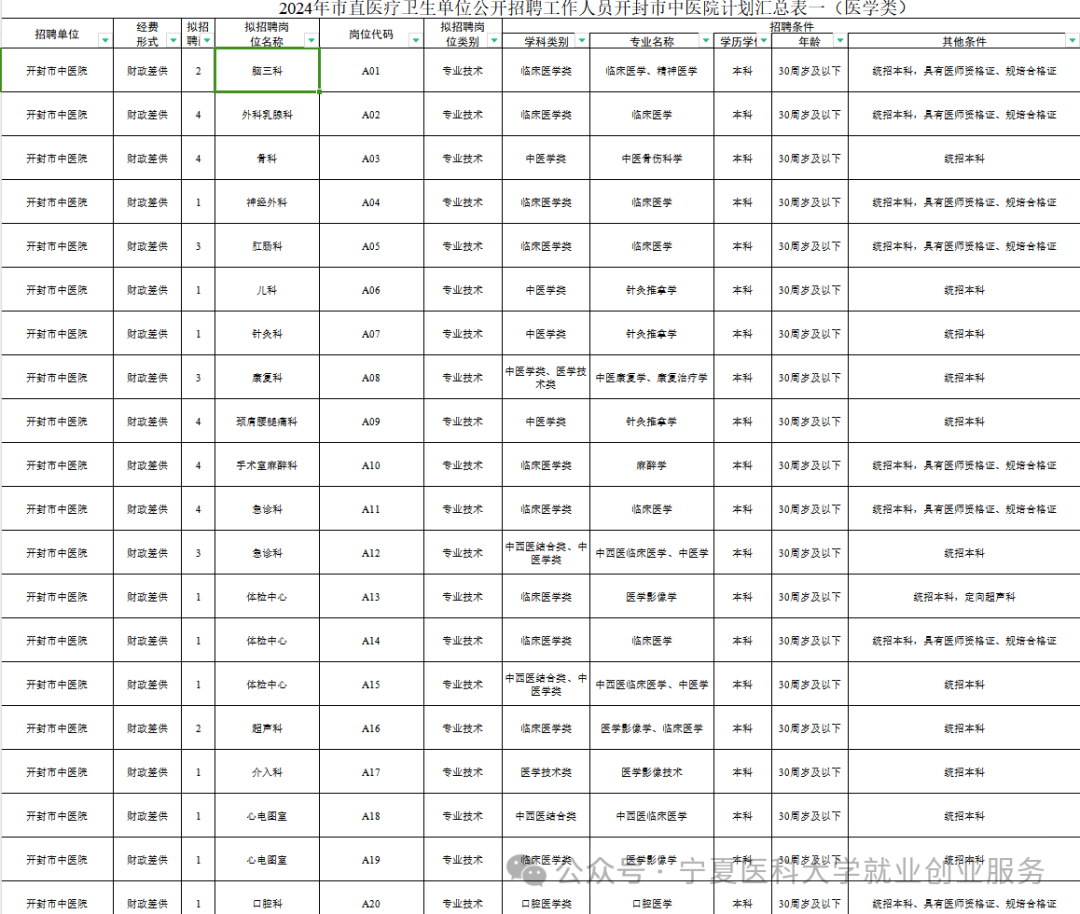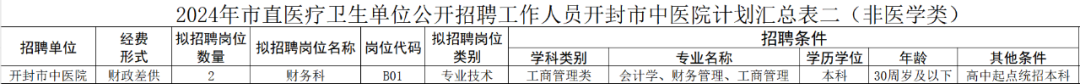 具体拟招聘专业、岗位、名额及要求详见《2024年市直医疗卫生单位公开招聘工作人员开封市中医院计划汇总表》。